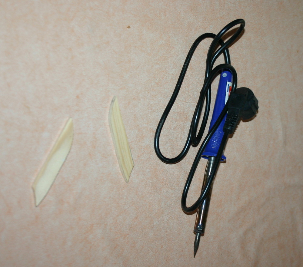 Für die Gestaltung der Federn habe ich mit der Laubsäge zwei Schablonen aus dünnem Sperrholz ausgesägt. Die Federn habe ich zwischen die zwei Schablonen geklemmt und mit dem Lötkolben die überschüssigen Teile abgebrannt. (Vorsicht...es stinkt).