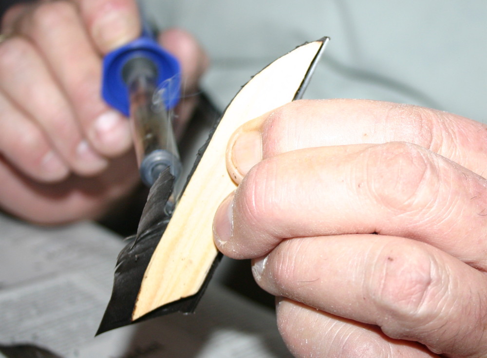 Vorgestern habe ich die 8 Hasel nochmals mit der HLP gerichtet und mit der Fliesensäge jeweils einen Schlitz für die Nockinlays geschnitten. Für die Nockinlays habe ich ein Stück Apfelkernholz genommen (das ist ein hartes Ding :o ). Danach habe ich die Nockinlays mit Knochenleim eingeklebt.
