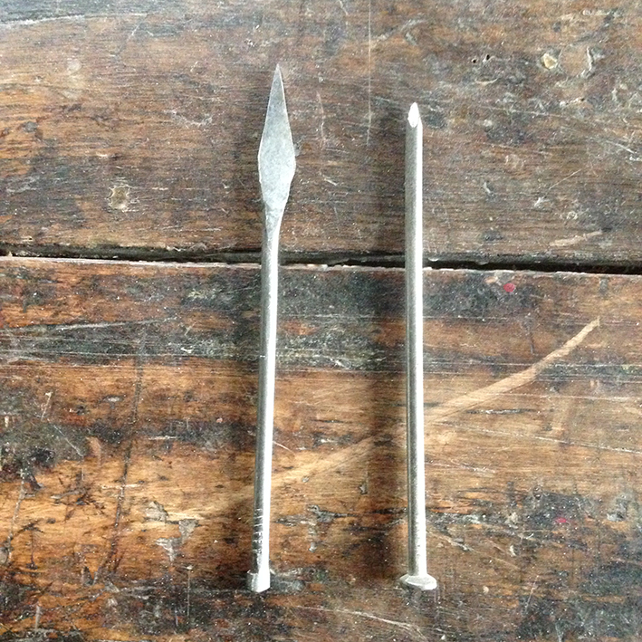 @max2 Hier mein Konusbohrer, daneben das Ausgangsmaterial - ein 130mm Nagel. Kalt geschmiedet und in Form geschliffen. Geeignet für Vorschaftmaterial aus Schösslingen. Der Markkanal dient als Führung und hält den Bohrer zentriert.
