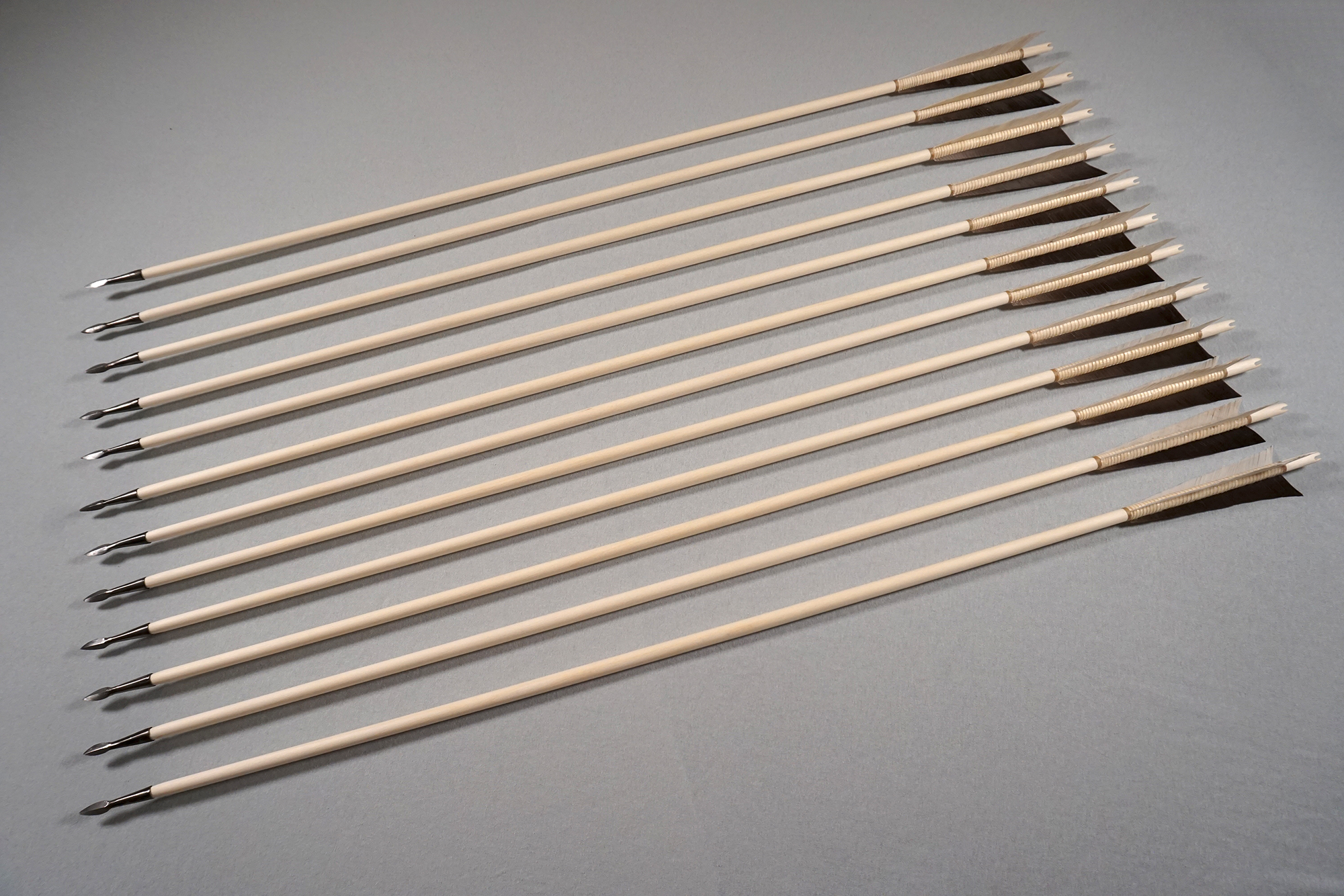 Für die folgende Interpretation orientiere ich mich also an den Informationen vor und nach dem 14. Jahrhundert. Für den Schaft eignet sich eine Fülle unterschiedlicher Hölzer, im vorliegenden Fall handelt es sich um barrelled Pappelschäfte. Die Spitzen (von Hector Cole) sind ebenso variabel, hierzu gibt es zahlreiche archäologisch gesicherte Optionen.