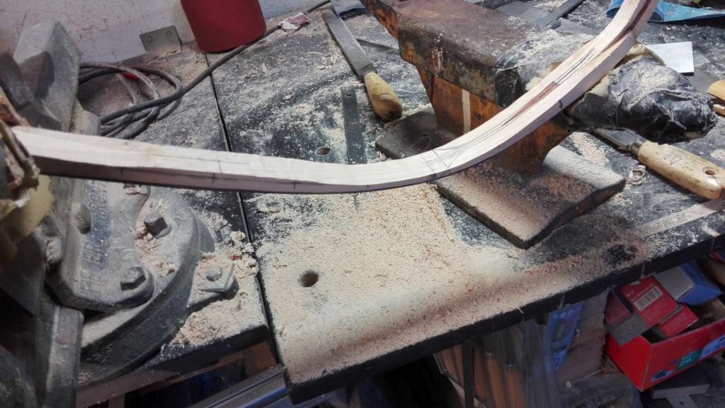 Ich habe die Rahmen fertig gemacht und geformt. Dabei habe ich die Kasane ein wenig vergrößert(weniger Biegezone= mehr Zuggewicht) und die Kerndicke ein wenig reduziert, sodass ich mit ein wenig mehr Sehne auf das gleiche Zuggewicht kommen müsste. Ich habe ja einen Bogen mit 116cm NtN und der andere ist 120cm NtN. Heute habe ich dem kleinen Bogen seine erste Lage Sehnen spendiert, der große hat seine erste Lage bereits 2Tage.