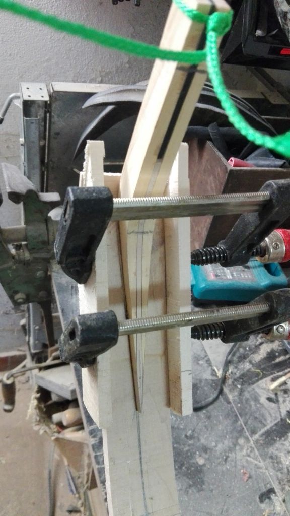 So trotz Rückschläge , die ich hier verkraften musste, gebe ich nicht auf und fange von vorne an. Ich habe mir überlegt wie ich Verdrehungen und leicht aus der Flucht gekommene Rahmen von Anfang an vermeiden kann. Ich habe mir ein Hilfsmittel gebaut, womit sich die Rahmen einspannen lassen und in aller Ruhe verklebt werden können. Auch habe ich die Griffspleiße in dieser Vorrichtung aufgezeichnet, so bleibt von allesschön gerade und an seinem Platz. Die Rahmen werden zwischen die beiden Hölzer mit Schraubzwingen geklemmt. Das eine Holz ist bereits mit von Anfang an mit Schrauben fixiert und das Zweite wird erst mit Schrauben fixiert , wenn der Rahmen mit den Schraubzwingen eingespannt ist und perfekt sitzt. Danach können die Schraubzwingen zu besseren Handhabung abgenommen werden. Zum verkleben kann nun der Griff heraus genommen und mit Hautleim bestrichen werden. Anschließend den Griff wieder einsetzen und mit Keilen richtig druck aufbauen, ohne das etwas wegrutscht. Die dürfen nun erst mal trocknen und dann geht's weiter... Ja ich weiß ich bin gaga 4 Komposit zur gleichen Zeit