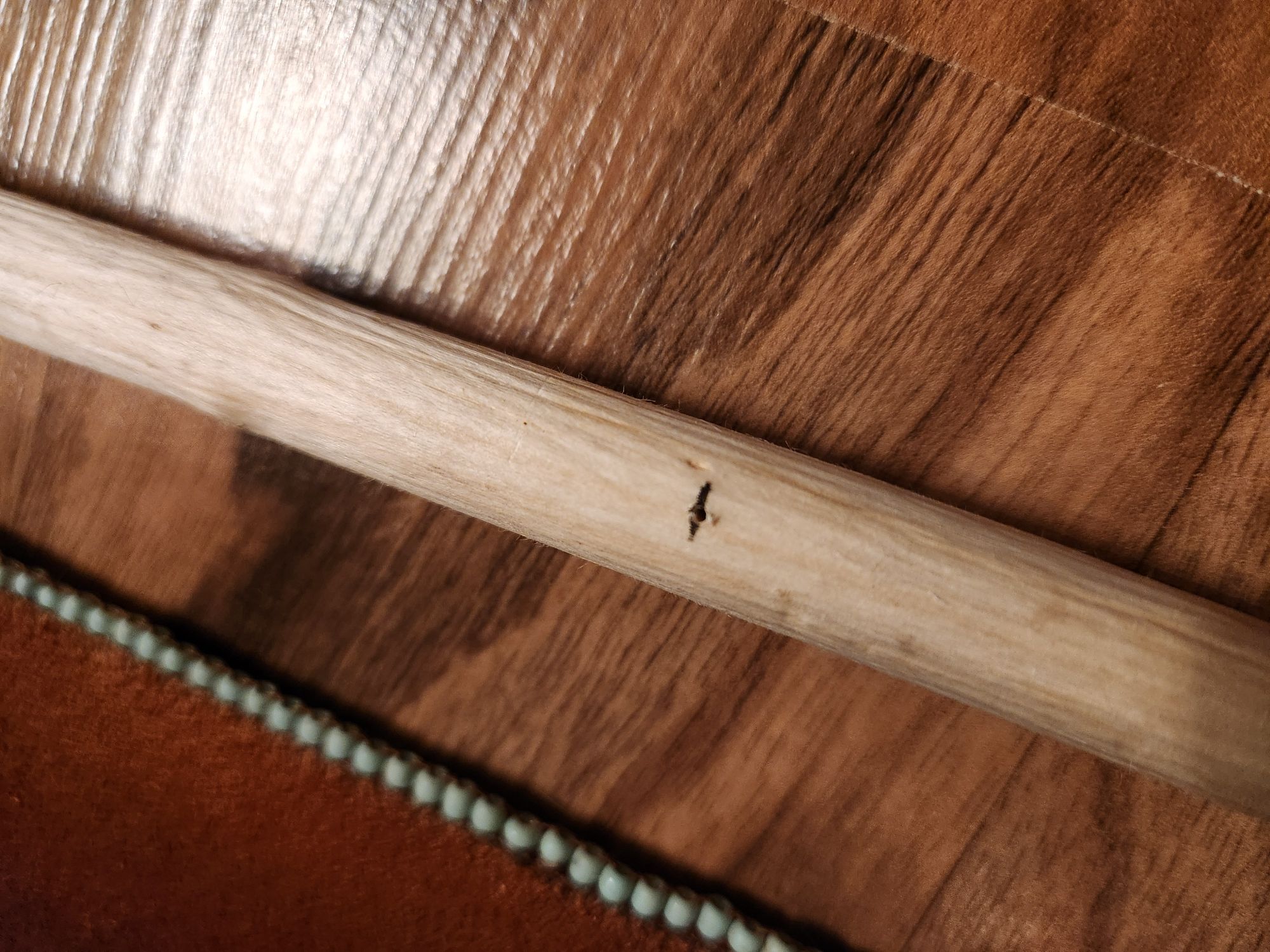 Die letzten Tage war ich wieder fleißig am Werk. Nachdem ich die beiden äußeren Riemchen befestigt hatte, hab ich als nächstes den Köcherstock befestigt. Nur so konnte ich sicher stellen dass die innenliegenden Riemchen auch schön am Köcherstock anliegen. Jedenfalls sind die Ziernägel, mit denen man die Riemchen am Stock befestigt, so weich dass ich vorbohren musste. Gar nicht leicht einen 1mm Bohrer in ein Bohrfutter einzuspannen. Die Bohrfutter meiner Bohrmaschinen gehen jedenfalls allesamt nicht so eng einstellen. Ich hab dann den Bohrer mit Isolierband umwickelt. Hat zwar auch nur mäßig funktioniert aber für 4 Löcher wars vertretbar.
