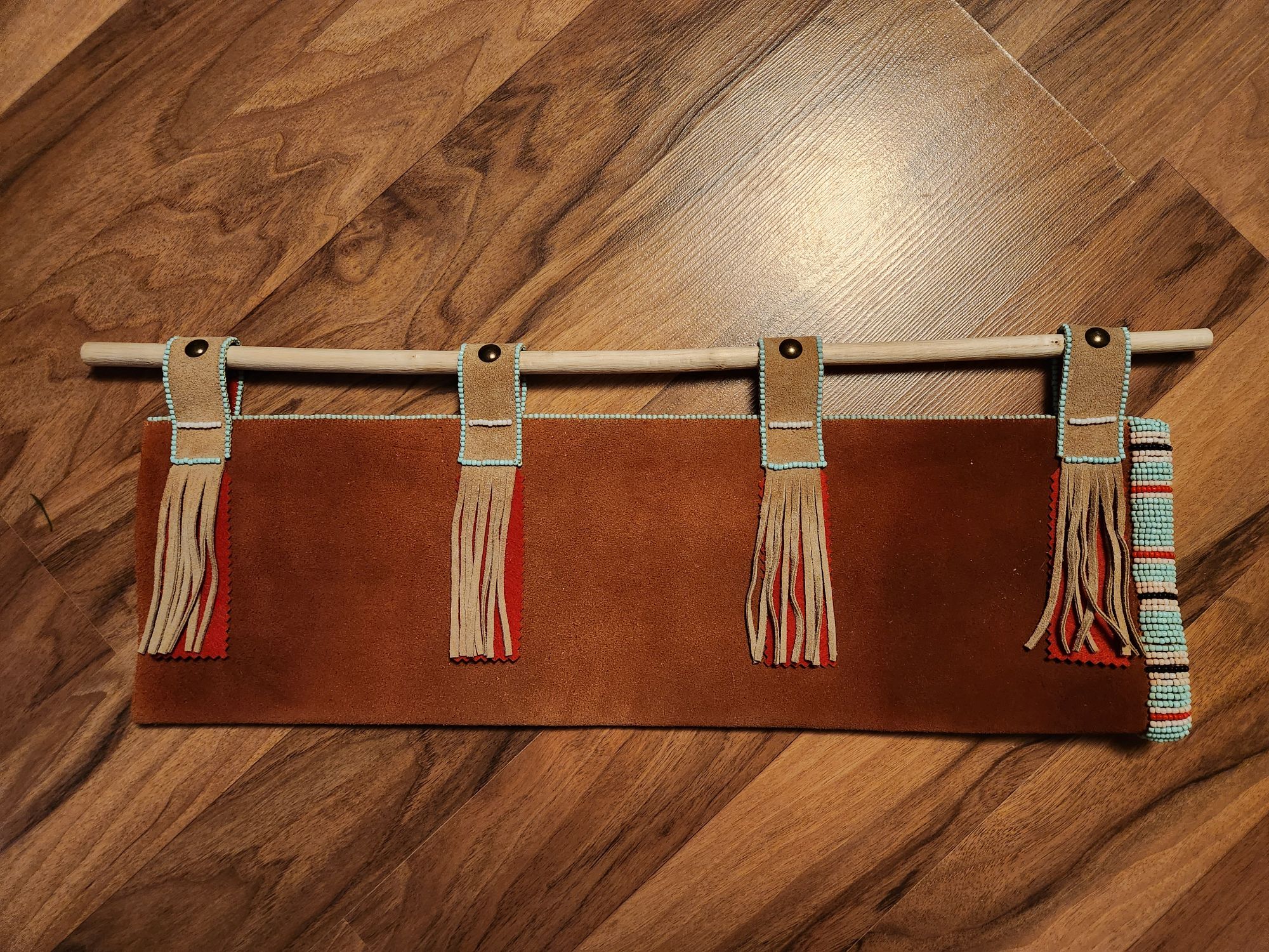 Den Umhengeriemen hab ich auch am Köcher festgenäht. Den Mittleren der 3 Riemen hatte ich aber noch nicht mit Perlen eingefasst da ich dachte ich müsste ihn noch kürzen. Tatsächlich scheint die volle Länge aber gut zu passen.