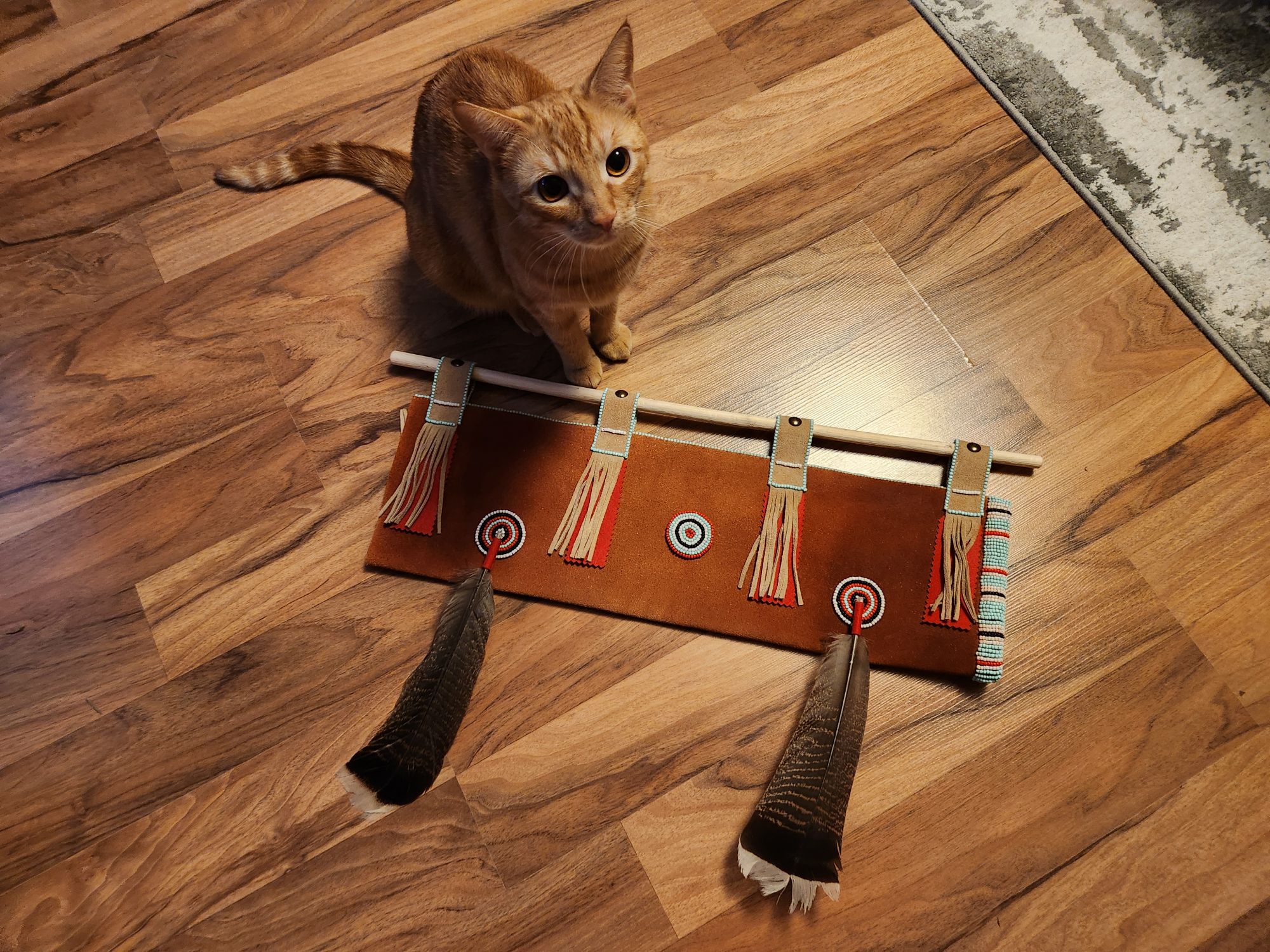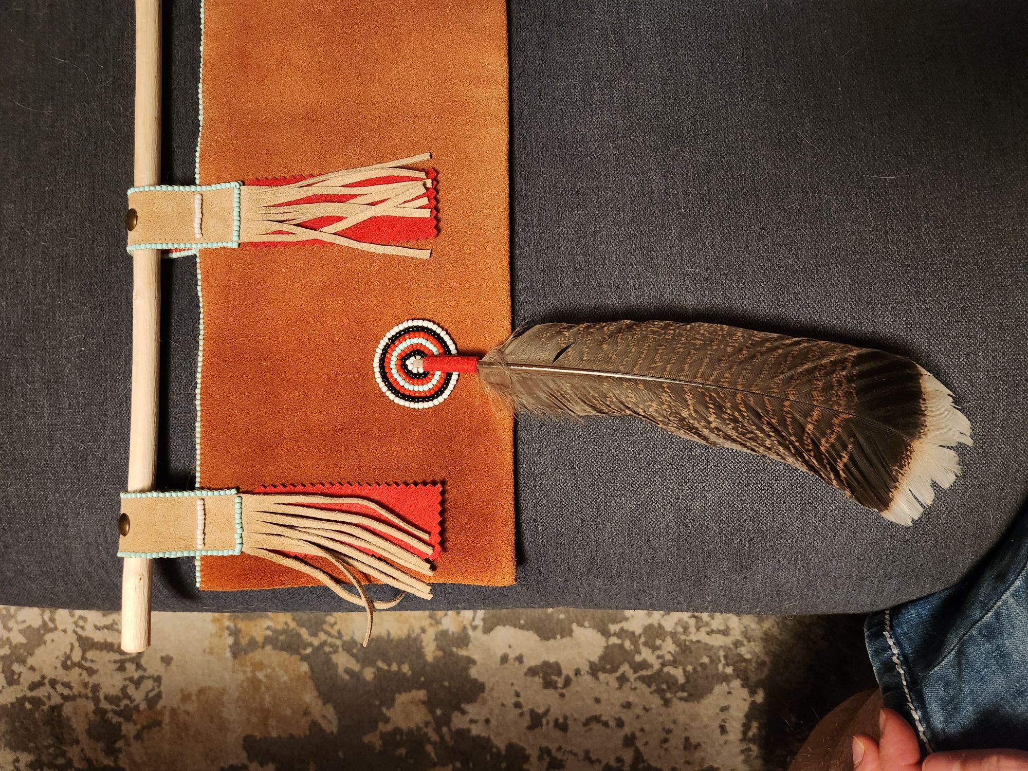 Heute hab ich das zweite Zierelement mit Feder gefertigt und angenäht. Das dritte hab ich auch schon gefertigt aber noch nicht befestigt, denn da soll eine Strähne Pferdehaar dran, die ich erst noch vom Pferd meiner Frau stibizen muss
