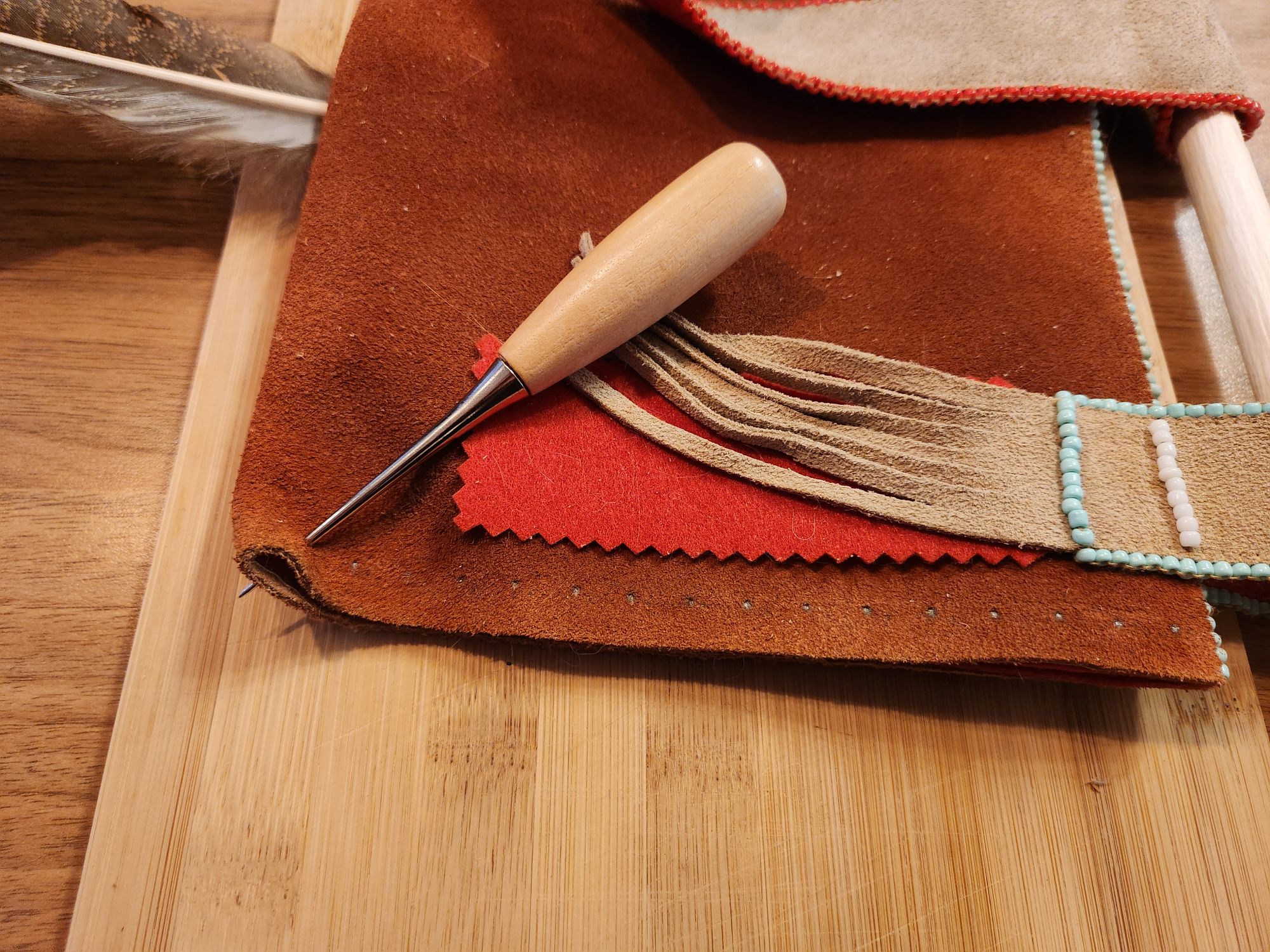 Nun ist der Umhengeriemen auch fertiggestellt. Noch kleine Löcher gestanzt und mit Lederbändern verknotet.
