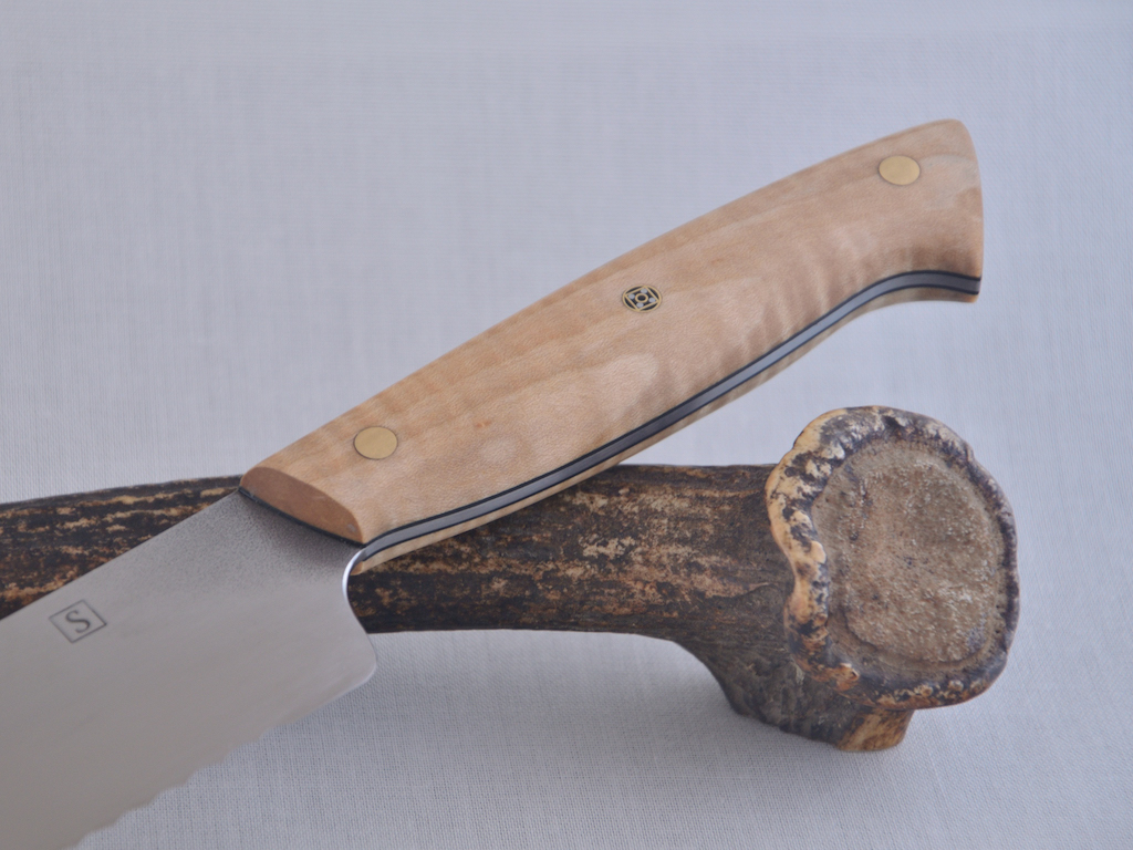 Mein Zahnarzt bekommt dieses Messer. Kurz vor Weihnachten waren seine Frau und er bei uns zu Essen und da wurde quasi dieses Messer bestellt. Ich habe dann gleich in meinen Holzvorrat gegriffen und sie haben sich das Holz, die Nieten und einen Mosaikpin ausgesucht.
