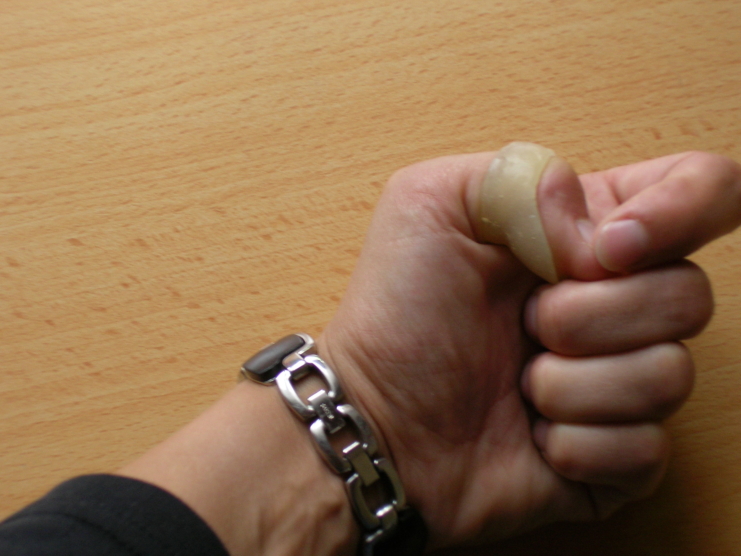 Ich besitze keinen digitalen Fotoapparat. Sobald ich irgendwo einen leihen kann und Zeit finde (das wird wahrscheinlich Wochenende), kriegst Du ein Bild! Hand mit Daumenring in Schießgriff, von allen Seiten?