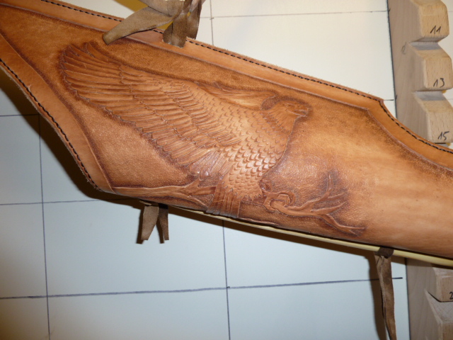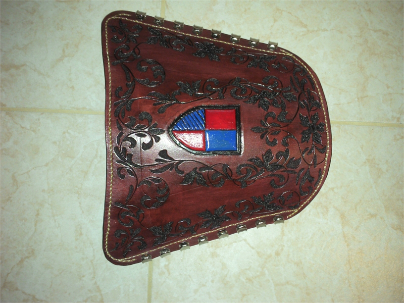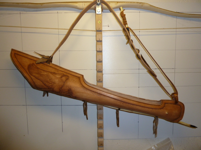 So, wie versprochen noch eine weitere Lederarbeit. Ein Seitenköcher, da Rückenköcher toll aussehen, aber eher unpraktisch sind, wenn man viele Pfeile fliegen lassen will. Gefertigt aus 3,5mm Blankleder, punziert und mit Oildye walnuss gebeizt. Das Motiv der 2 Drachen habe ich mir vom Jeling-Stil abgeschaut. Die Naht ist mit einer Lederahle vorgestochen und mit Dacron vernäht. Der Köcher ist schön ausbalanciert, die Pfeile sind 28" lang.