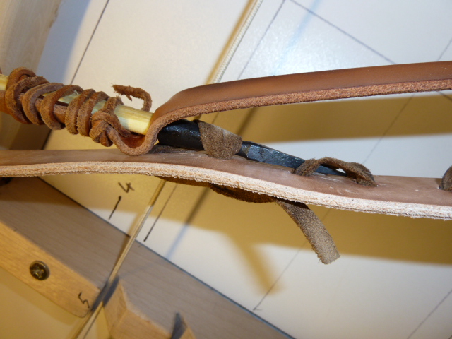 Detail: Bodkinspitze mit Pfeilrest als Längenverstellelement für den Tragereimen.<br />Natürlich mit Birkenpech eingeklebt ;-)