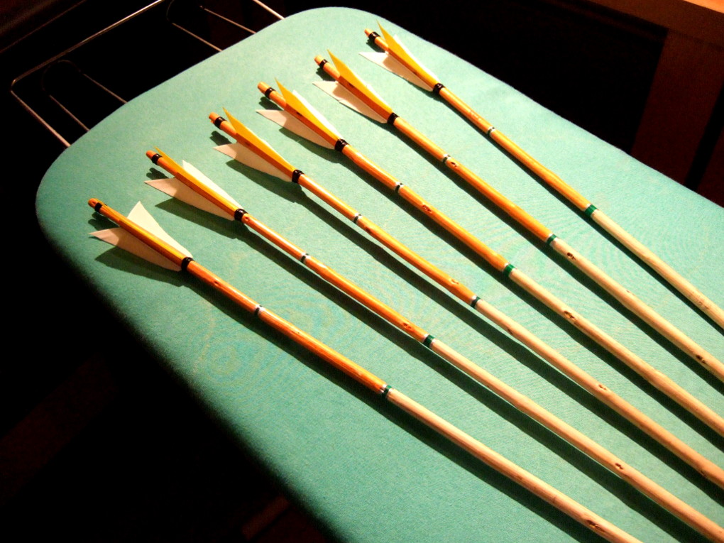 Wenn ich das richtig erkenne, sind das 100gr Spitzen, vermutlich kommt man wegen des Naturtapers auch mit 80gr Spitzen noch mit den FOC hin, aber das bringt auch nur 20gr Gewichtseinsparung. Die Pfeile könnten so mit diesen Spitzen für 35# bis 40# Bögen geeignet sein. Damit haben sie ein Gewicht von 11gpp bis 12gpp und das ist mir persöhnlich etwas viel. Ich versuche eigentlich immer unter 10gpp zu bleiben, es sei denn, der Bogen ist immer noch zu schnell, dann macht mehr Gewicht natürlich auch mehr bumms.