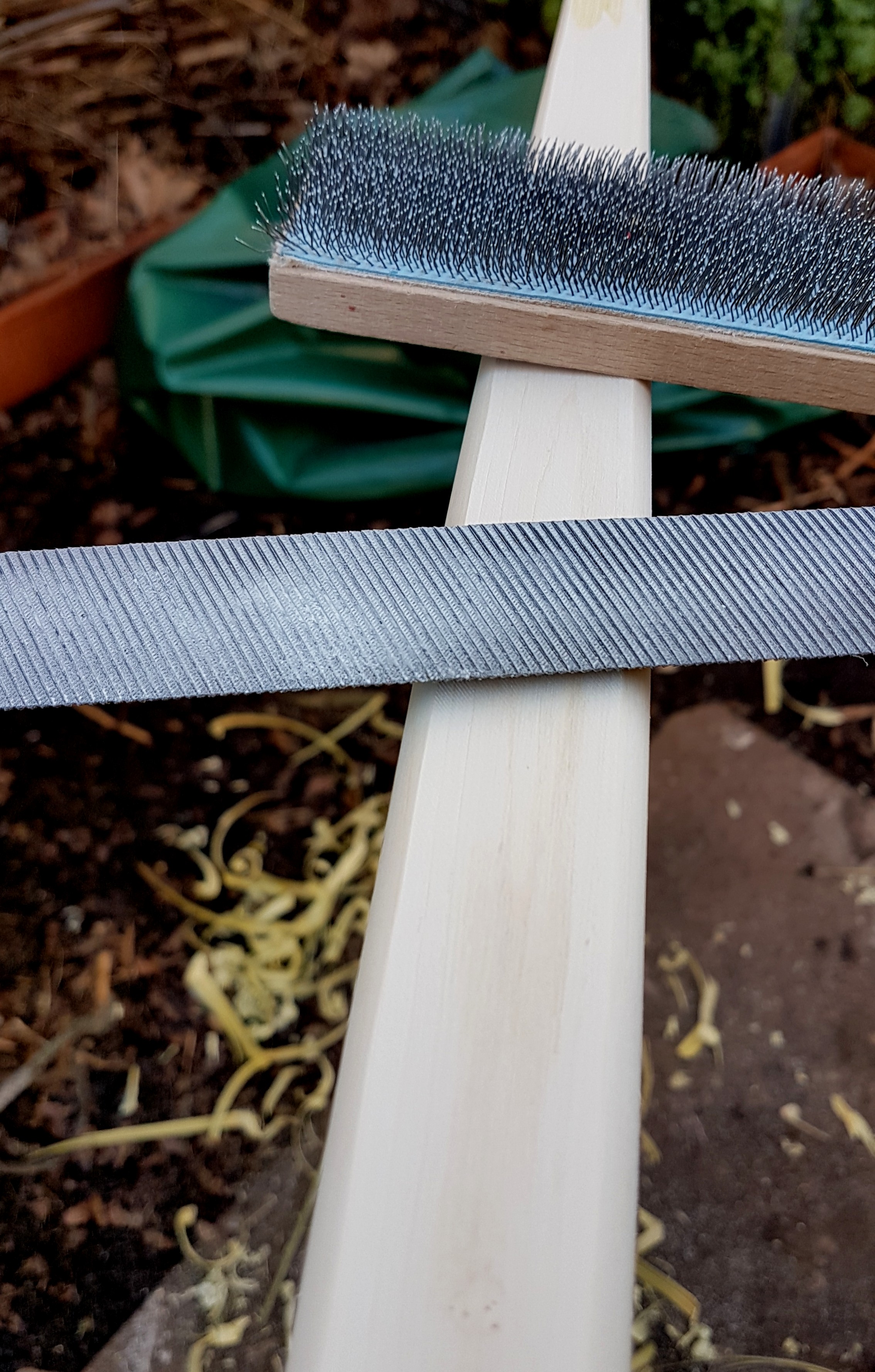 Seitlich neben den Streifen habe ich mühsam die Epoxid-Gummi Bestandteile entfernt, dann die Übergänge der Bambusstreifen zum vorhandenen Bogenrücken angefeilt und schließlich in den Wickelbereichen die Wachs-Silikatschicht des Bambus entfernt.