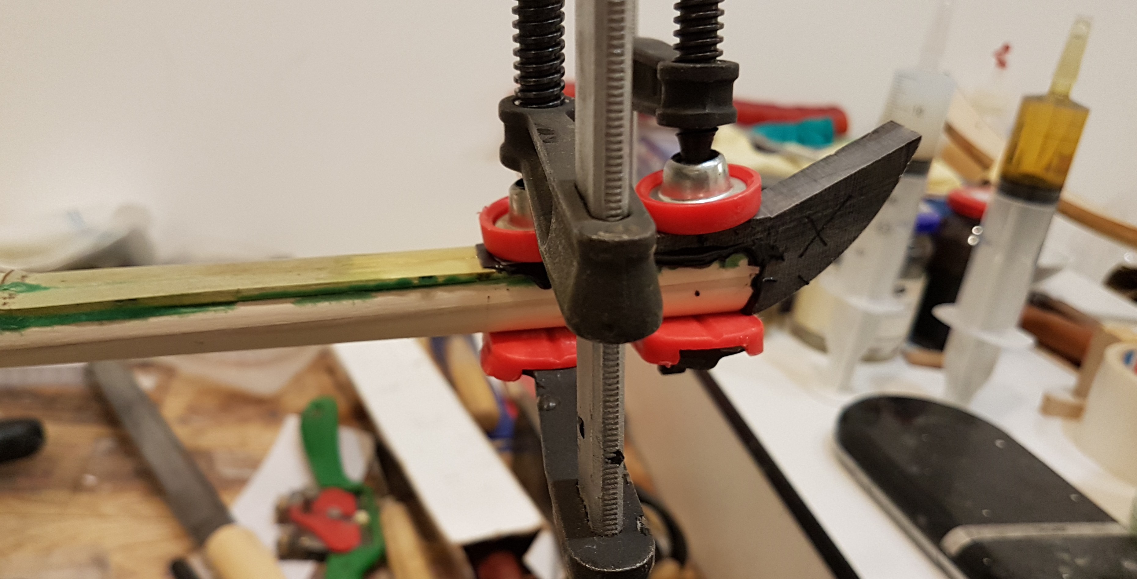 Ich habe zunächst mal ohne Kleber geschaut wie ich das Backing auf den Bogenrohling bekomme und wie ich die Zwingen setzen muss, damit ich das Konstrukt irgendwie noch in die Klebeform bekomme. Zum einen ist jede Menge des ursprünglichen Reflex weg, zum anderen habe ich den zusätzlichen Griffaufbau, der bei der Klebeform nicht berücksichtigt ist. Außerdem ist das Konstrukt jetzt nicht mehr eckig und hat seinen Seitentaper - alles Dinge die es schwierig machen das Backing mittig aufzukleben und das auch noch mit einer Form die nicht richtig passt.