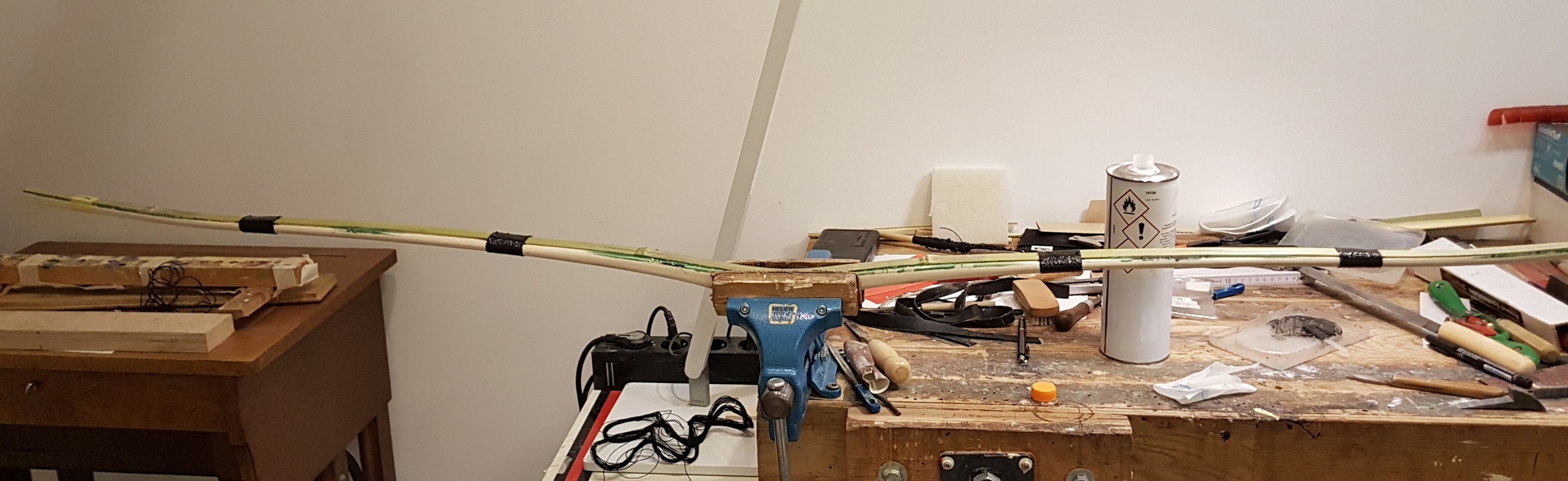 Gerade eben alles entzwungen und Klebeband entfernt. Danach kam das Konstrukt gleich auf meine Einbiegewand und auf Standhöhe. Und natürlich musste ich auch gleich mal schauen wie das Ding biegt. Beim Zuggewicht hat sich praktisch nichts verändert, also ca. 60#@28". Ich habe vorsichtig bis ca. 28" gezogen, bis es wieder leise geknistert hat. Die gleiche Stelle möchte nicht mitspielen. Dann werde ich die Stelle zum mitmachen zwingen
