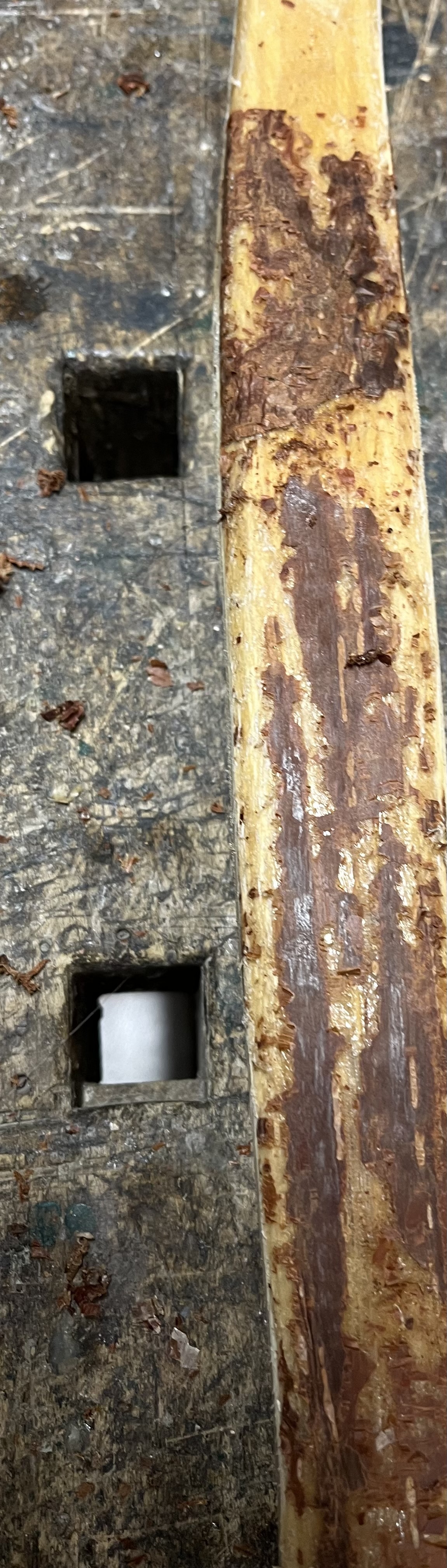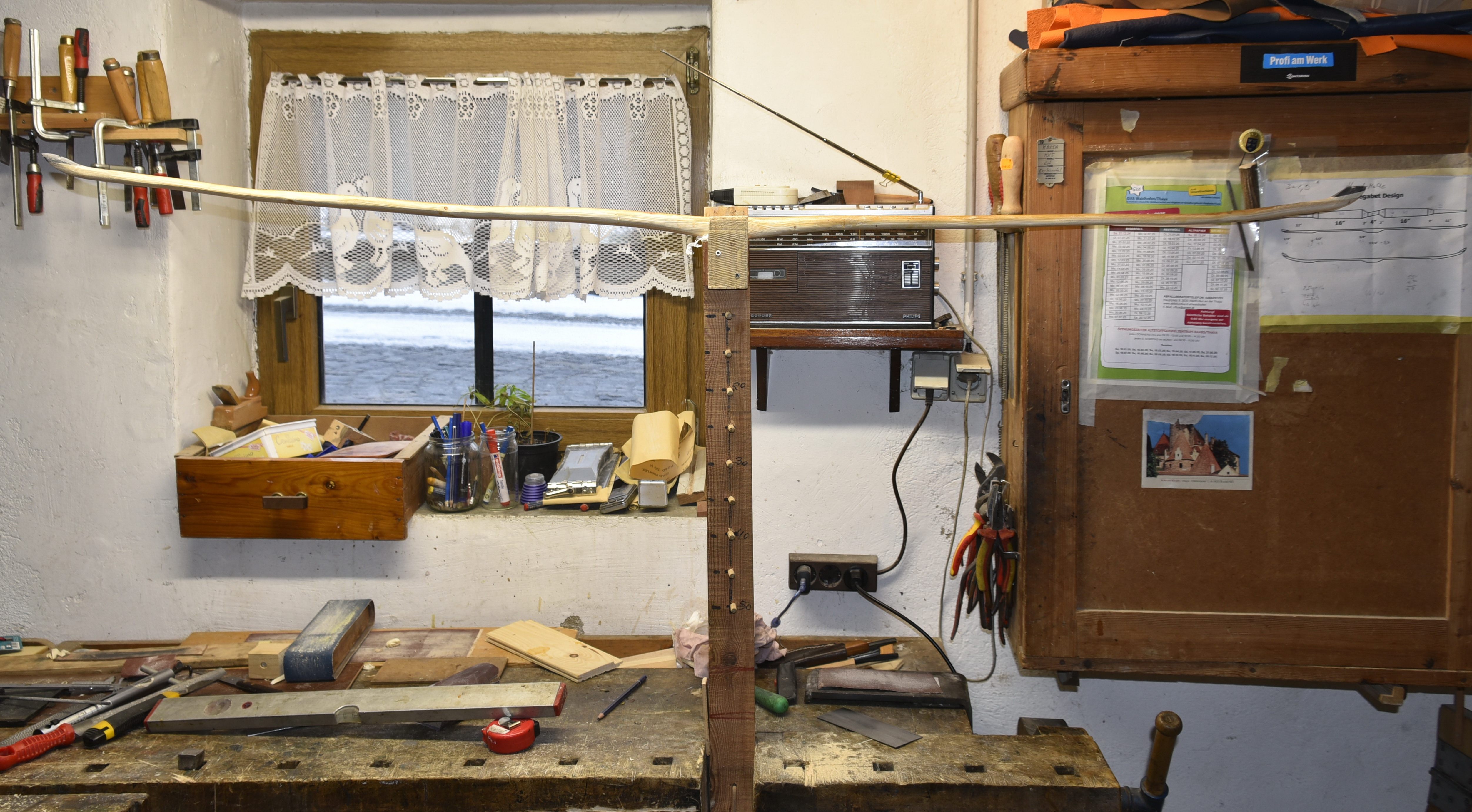 Keine gute Idee, die Rinde ging nicht mehr runter, dafür hat der Bogen durch die Feuchtigkeit wieder ordentlich Deflex.