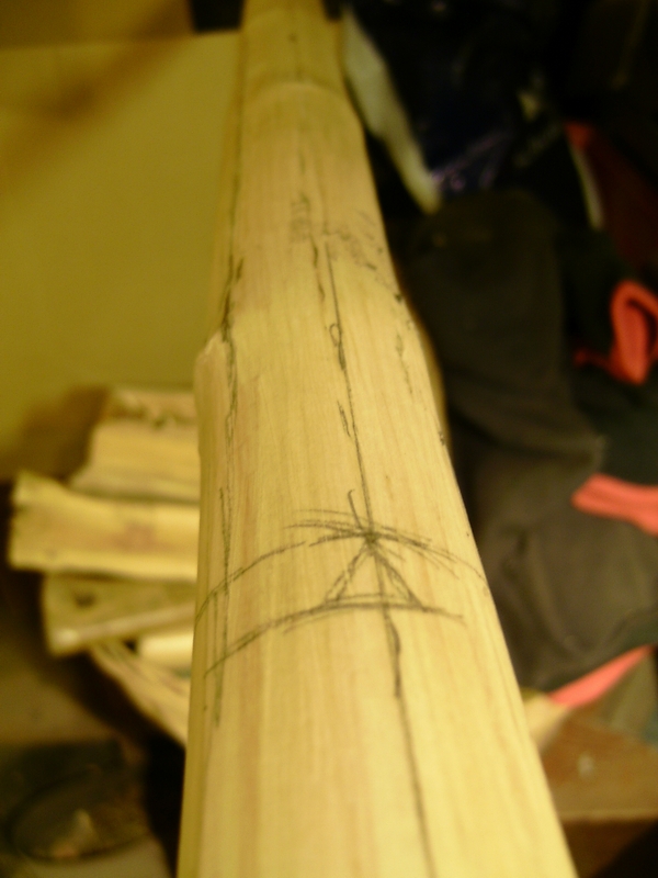 Länge derzeit 152 cm, es soll ein halbpyramedialer Bogen mit rund 50 bis 60 lbs werden. Die maximale Wurfarmbreite wird nur rund 33 mm betragen, denn mehr gab das Holz leider nicht her.