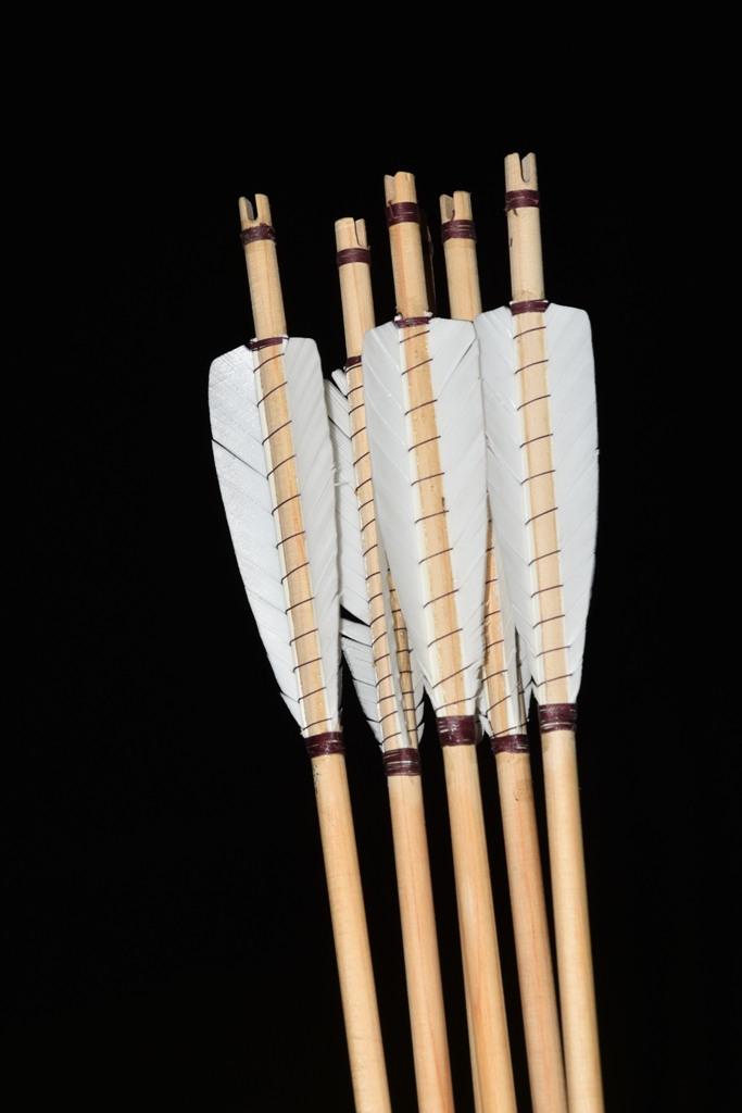 Die Schäfte sind aus Zeder 11/32, gebarrelt beidseits auf 5/16 Länge 29" Spitzen 120gn, Spine 48#, Gewicht mit Spitze 29.5Gramm einmal plus 1g einmal -1.5g Federn weisse Gans, Danke an Fitzgerald.