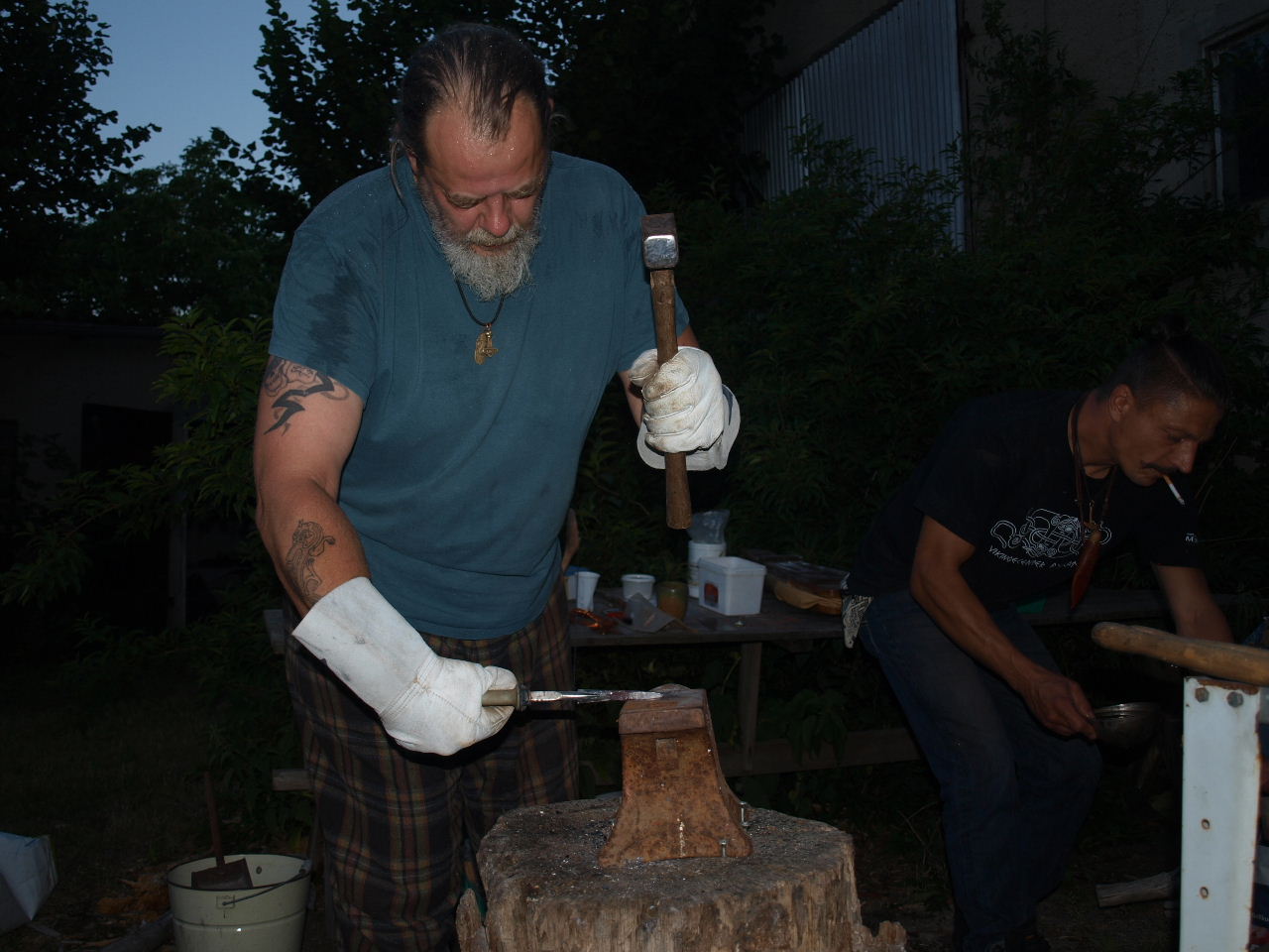 Eddy hatte seine Esse dabei und zeigte uns das Schmieden einer Tüllenspitze für Warbow-Pfeile, sowie das Gießen von Schmuckstücken in Zinn und Bronze (verlorene Form).