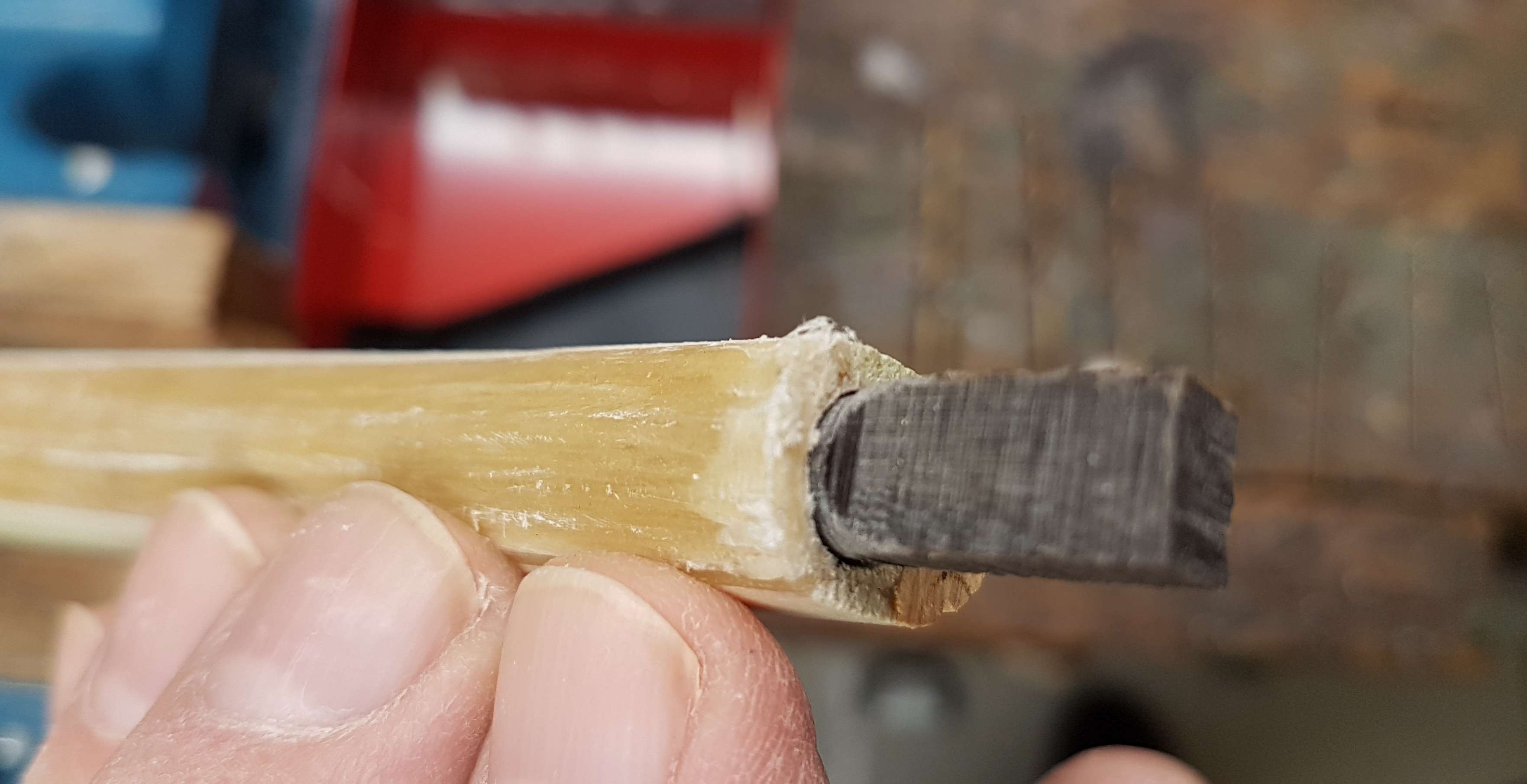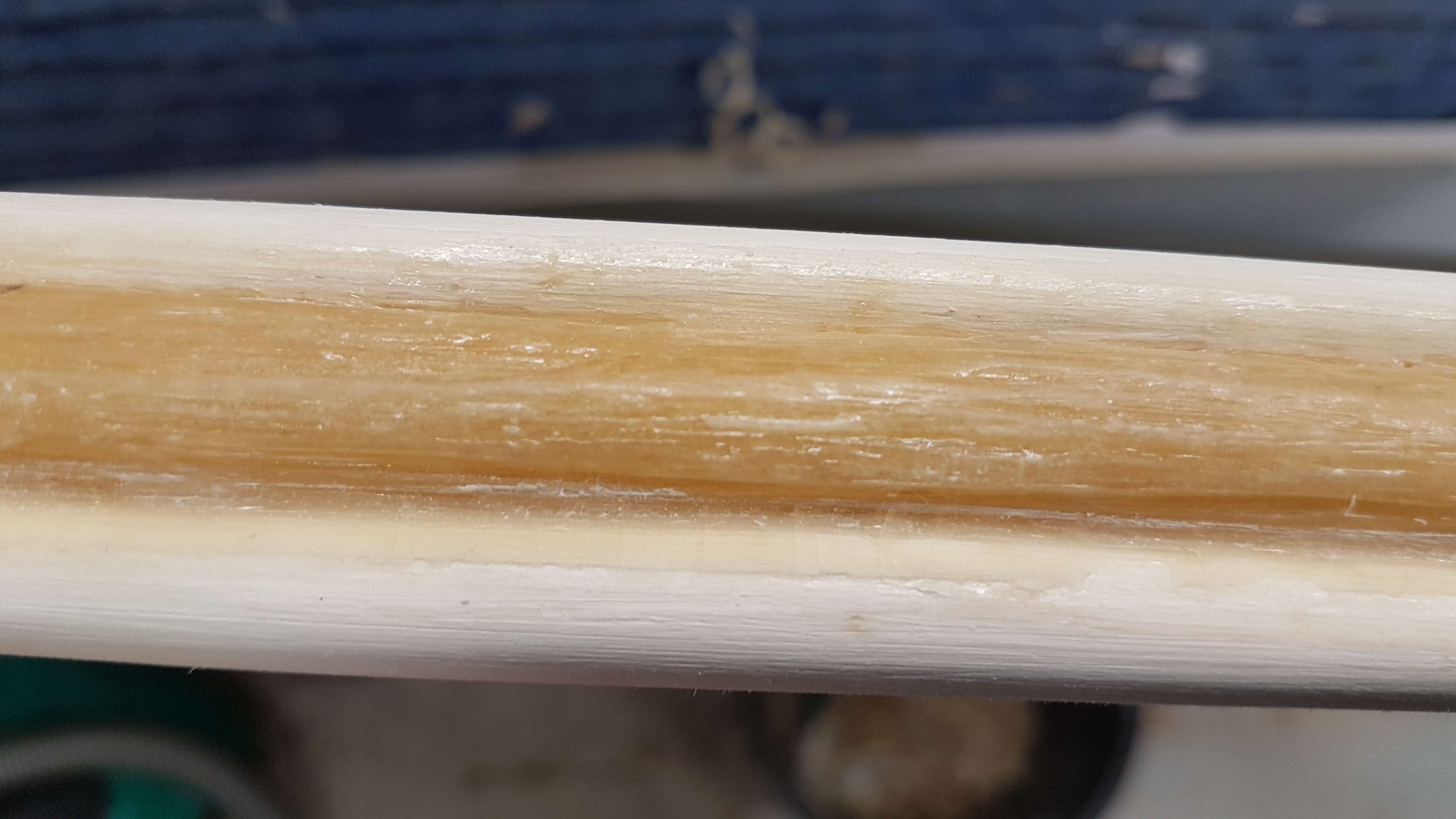 Bevor ich anfing nachzudenken, hatte ich weiter Holz abgetragen, schonmal an Stellen an denen kein Holz mehr abgetragen wird Unebenheiten weggeschliffen und jetzt mal geschaut was ich da verbrochen habe. Tiller ist fast fertig, an zwei Stellen noch ein bischen Holz abtragen und dann gibt es volle Standhöhe. Die WA-Enden sind jetzt bei ca. B 13 x H 18 mm, die Mitte bei ca. B 36,5 x H 36 mm.