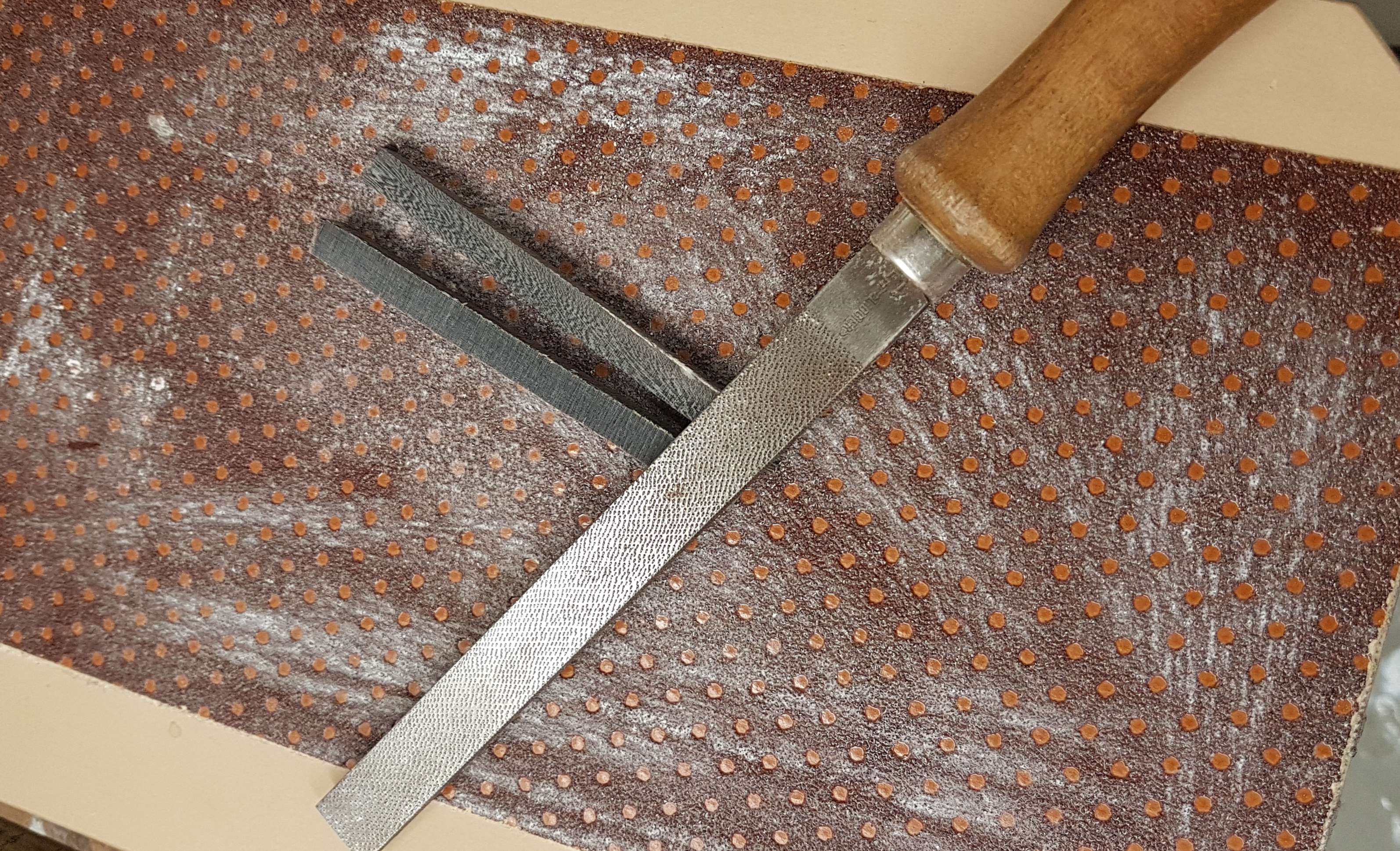 Heute wurden die Hornstäbe eingeklebt und das Rohhautbacking aufgeklebt.