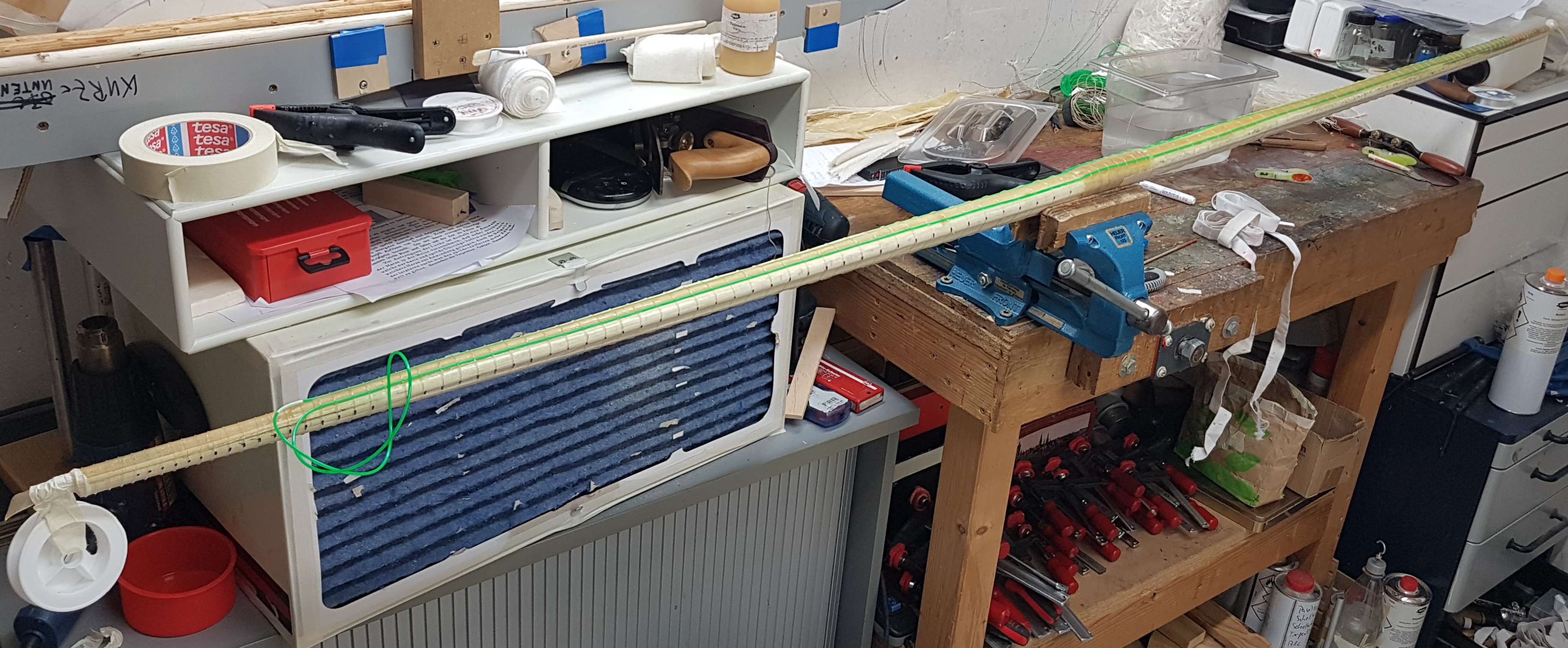 Das Ding habe ich gestern von den Wicklungen befreit und auf einem Heizkörper geparkt. Heute habe ich den Rücken geputzt, die Ränder der Rohhaut abgefeilt und weiter getillert. Volle Standhöhe und max. 21" Auszug, weiter wollte ich ohne die Wicklungen an den WA-Enden nicht gehen. Während des Tillervorgangs hat sich der Bogen mehrfach seitlich verzogen, sehr kritisch das ganze Dingens, ich denke aber dass ich den Verzug vollständig entfernen konnte (was immer Zuggewicht kostet, so iss das halt wenn man unbedingt aus etlichen verschiedenen Stücken Holz einen Bogen bauen muss