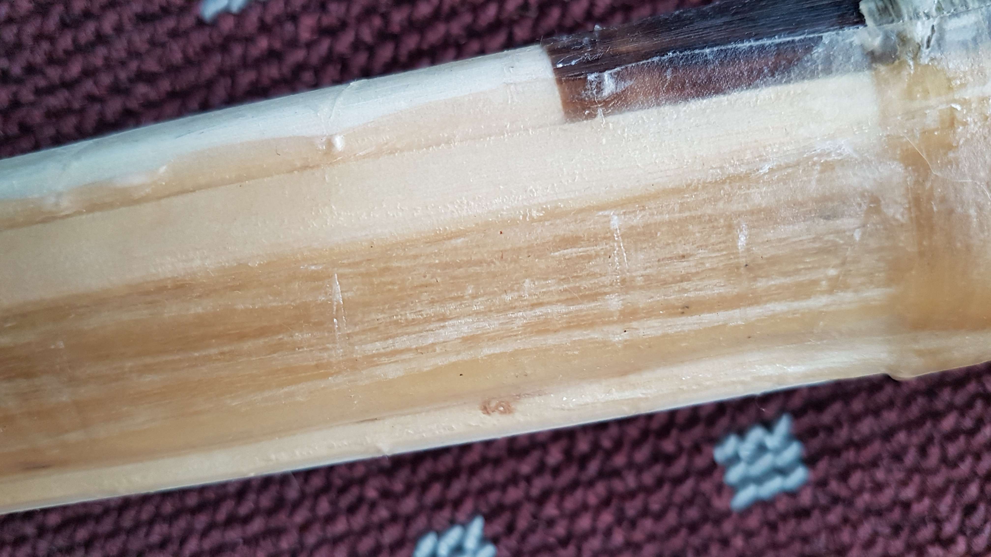 Heute habe ich überschüssigen Kleber vom Rücken entfernt (von der Sehnenlage und neben der Lage) und mehrere Lücken direkt neben dem Sehnenbelag mit trockener Sehne gefüllt. Immerhin 10 g unnötige Masse entfernt. Der Bogen hat aktuell 730 g.
