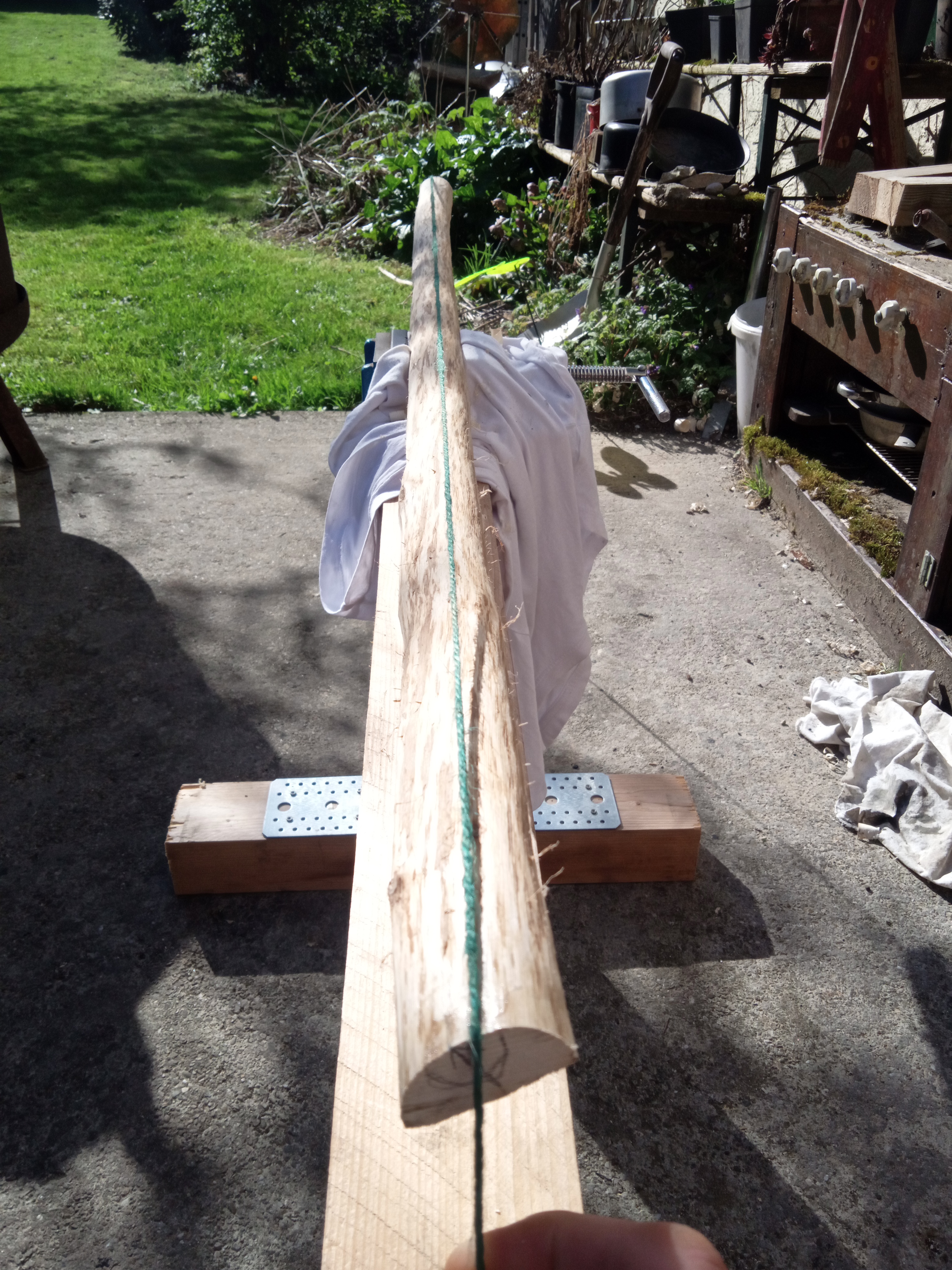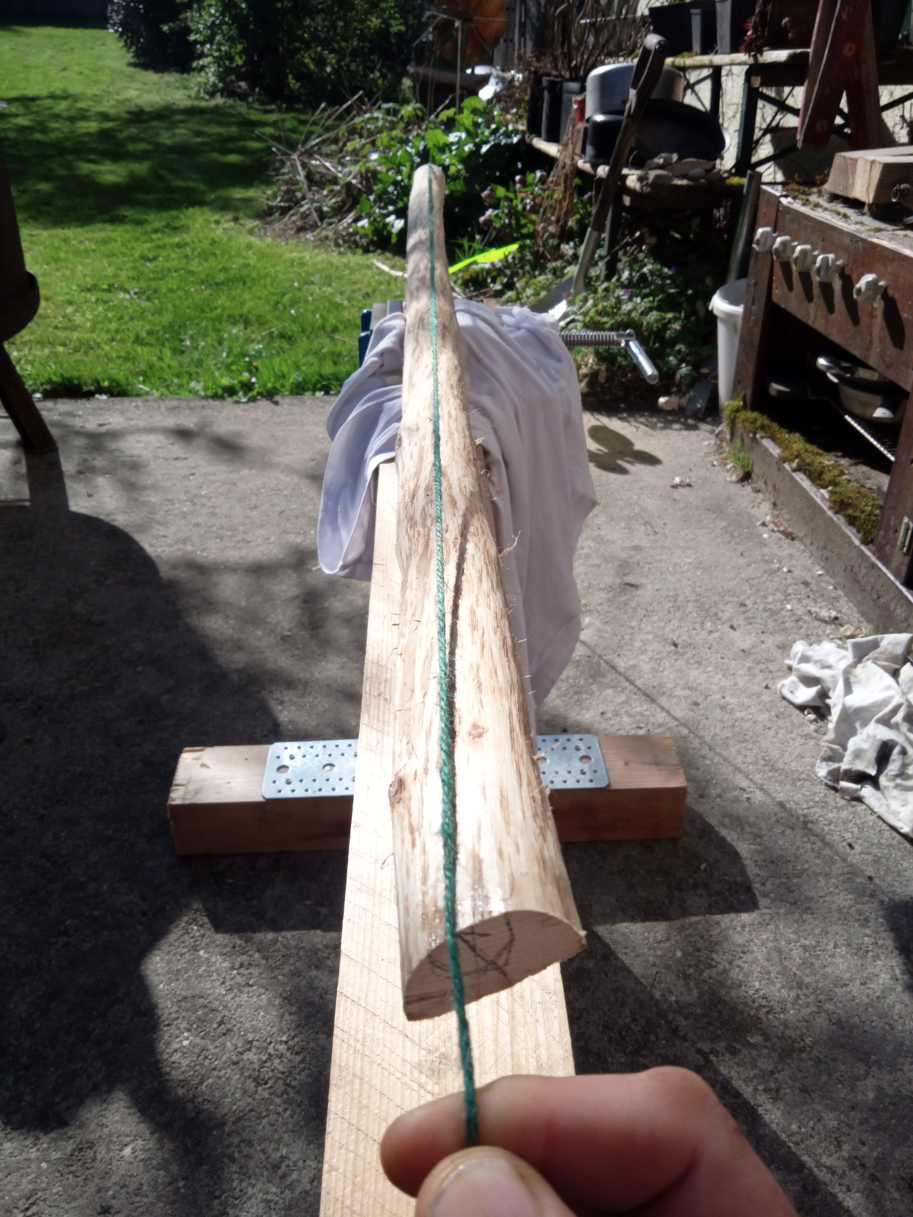 Sehne leider immer noch leicht außermittig und nicht wirklich halbpyramidal. Eher so 40:60 parallel zu pyramidal. Das ging wegen einem seitlichen Ausriss leider nicht anders. Breite an den Tips ist jetzt 15mm.