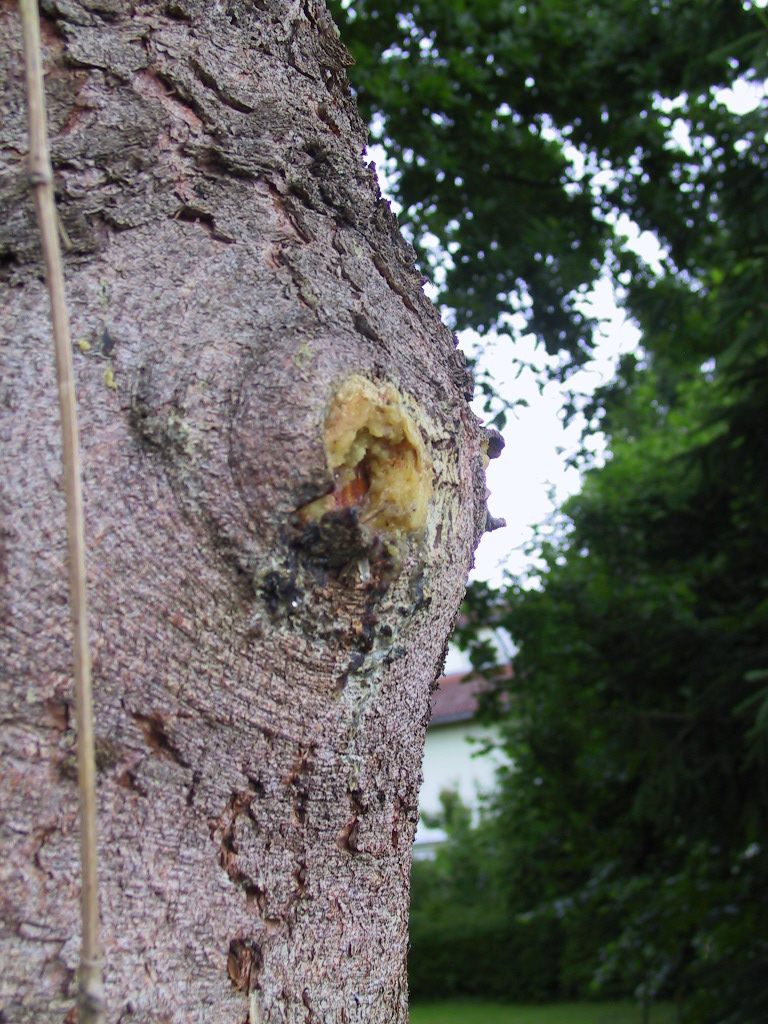 Also weiter forschen. Wikipedia macht’s möglich. Dadurch fand ich heraus, daß das K letztendlich der „kristalline“ Rest von Nadelbaumharzen ist, aus denen man die ätherischen Öle herausdestilliert hat. Also warum nicht gleich direkt Baumharz nehmen. Nachdem ich eine 1/4Std im Garten die Schwarzkiefern und Fichten (siehe Foto) abgeklappert hatte, konnte ich mit einem Joghurtbecher voll Harzbrösel in die Werkstatt zurückkehren.