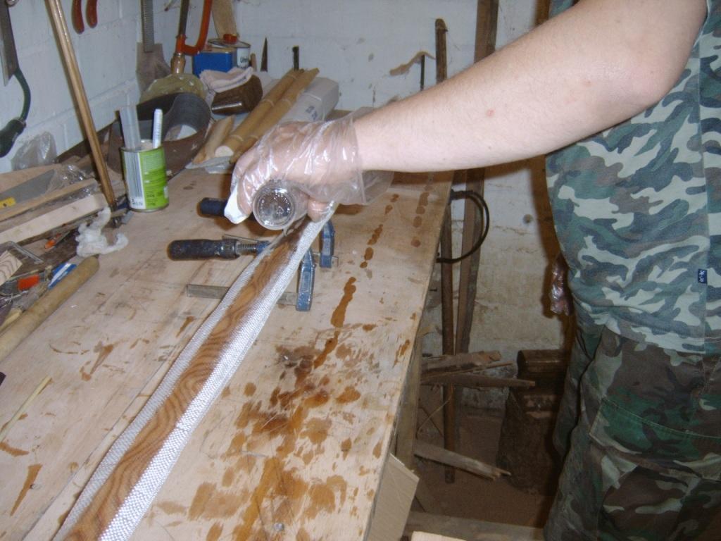 4: Mit Glasfaserband kann man auch eine unregelmäßige WA- Oberfläche (z.B. eines Selfbows, bei dem man das Zuggewicht erhöhen möchte oder der schlicht einen stabilen Bruchschutz benötigt...) mit Glas belegen...