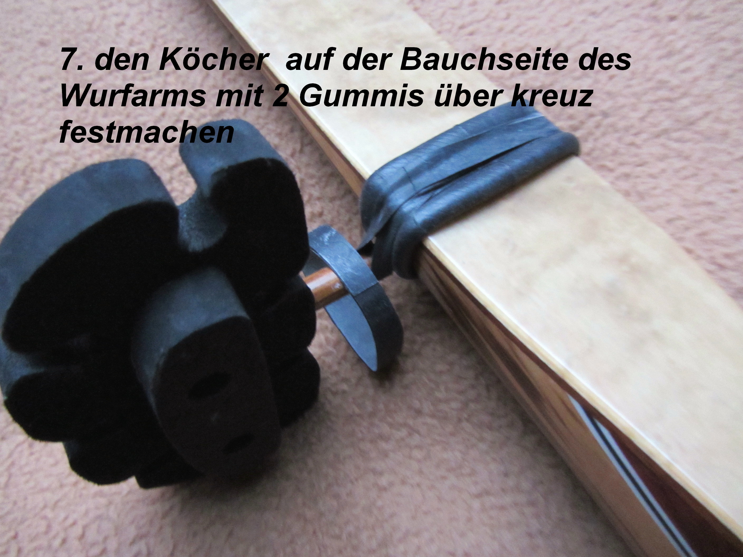 Kann ich, aber nicht heute. Die Wurfarme werden vor der Montage dauerhaft mit einem Stück Fahrradschlauch unterfüttert, so klappert und verutscht nichts und die beiden Köcherteile mit je zwei Gummis vom Fahrradschlauch befestigt. Hält richtig gut. Mit einen oder zwei montierten Pfeilen wird der Köcher in sich stabil.