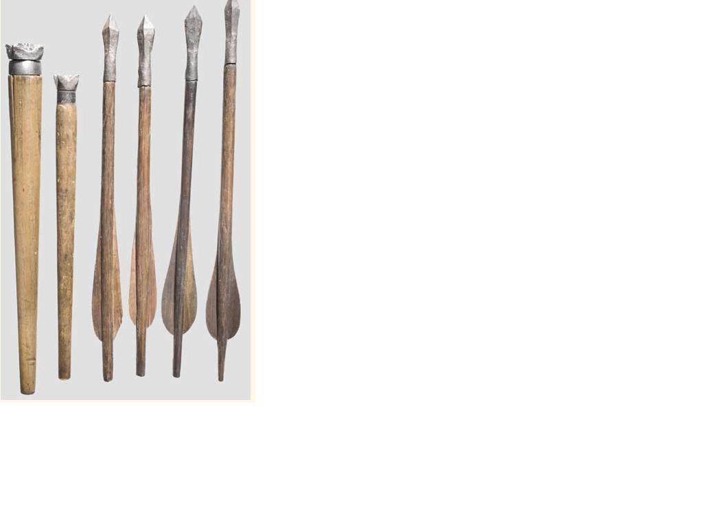 Bei den Bolzen mit den flachen oder kronenförmigen Spitzen handelt es sich um Bolzen für das Vogelschießen aus dem 19.Jh.
