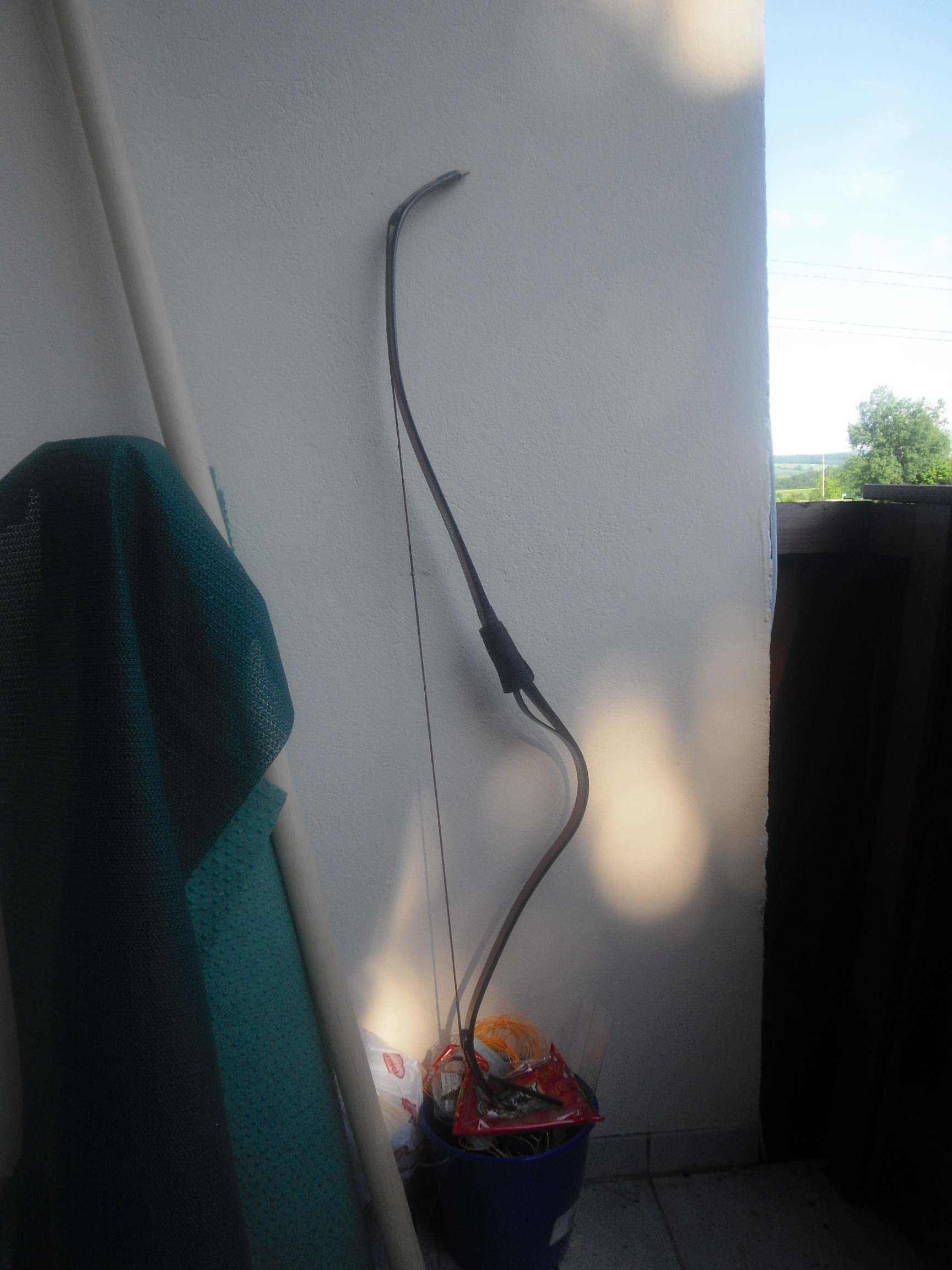 um für das Daumentechnik-Treffen (und während der Bauzeit eines Horn-und-Sehnen-Reiterbogens) trainieren zu können, habe ich mir den oben genannten Bogen geleistet. Heute erstmals probegeschossen, noch mit mediterraner Technik. Und dann, aua aua, zu Hause prompt auf den Kachelfußboden fallengelassen, so dass die rechte äußere Kante des oberen Wurfarmes diesen Kratzer abbekommen hat: Was meint Ihr, ist das problematisch? Wie könnte man die lackierte Oberfläche wieder "heilen"?