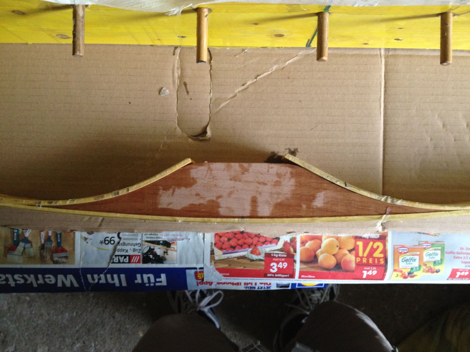 Und um Harzflecken durch austretendes Harz zu vermeiden das Glaslaminat auf Bogenbauch u. Rücken vorher zusätzlich mit einem breiten Streifen Tesafilm o. zur Not mit Paketklebeband schützen. (nur so als kl. Tip, da ich nicht sehe ob du evtl. schon drangedacht hast)