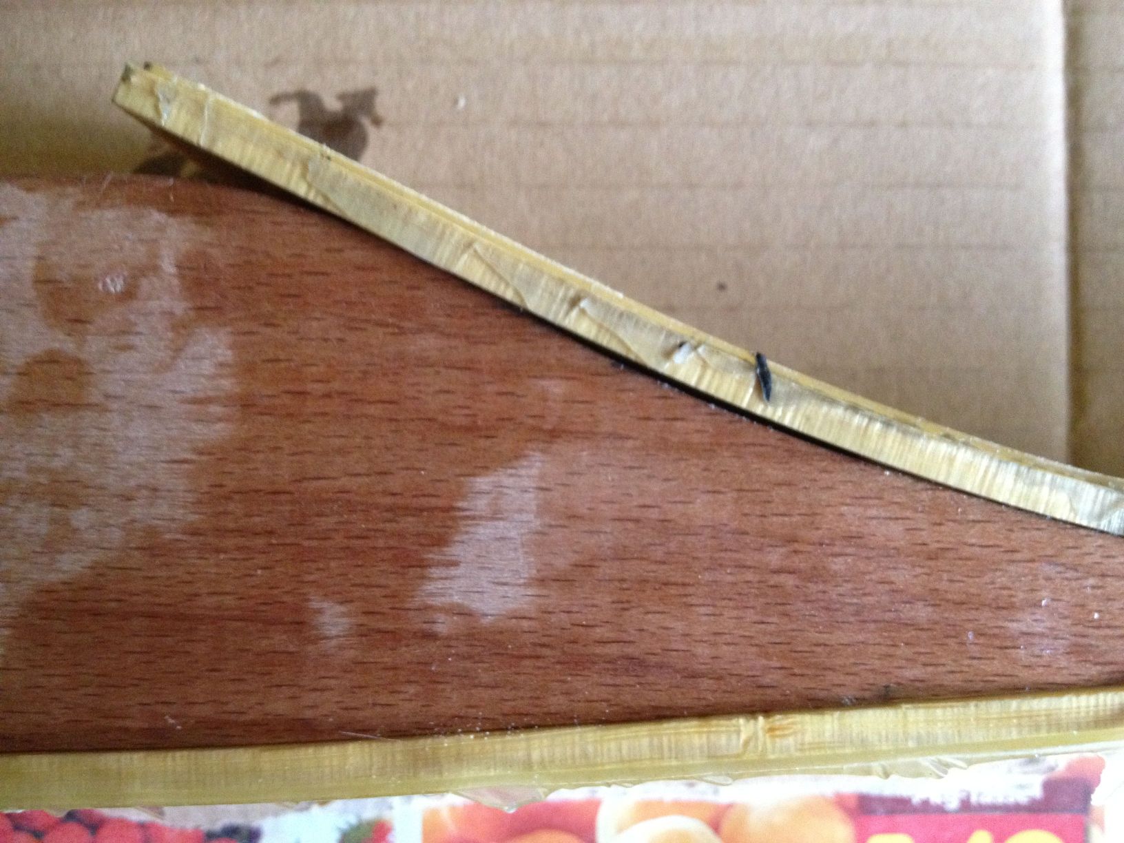 Aber selbst mit ordnungsgemäßem Mischverhältnis, hätte der Bogen wahrscheinlich nicht gehalten. Auf der Rückseite des Griffstücks im Bereich der Fadeouts hat sich das Bambuslaminat vom Griffstück abgehoben. Schon beim Probelauf hatte ich bemerkt, dass sich das Laminat nur schwer an das Griffstück anpressen ließ. Deshalb hab ich das Griffstück noch etwas nachgearbeitet und die Laminate etwas überstehenlassen, um diese besser in die Form pressen zu können. Hierzu wurden alte Fahrradschläuche verwendet, diese dürften aber zudem noch etwas nachgegeben haben, weshalb sich das Laminat dann schlussendlich abgehoben hat.