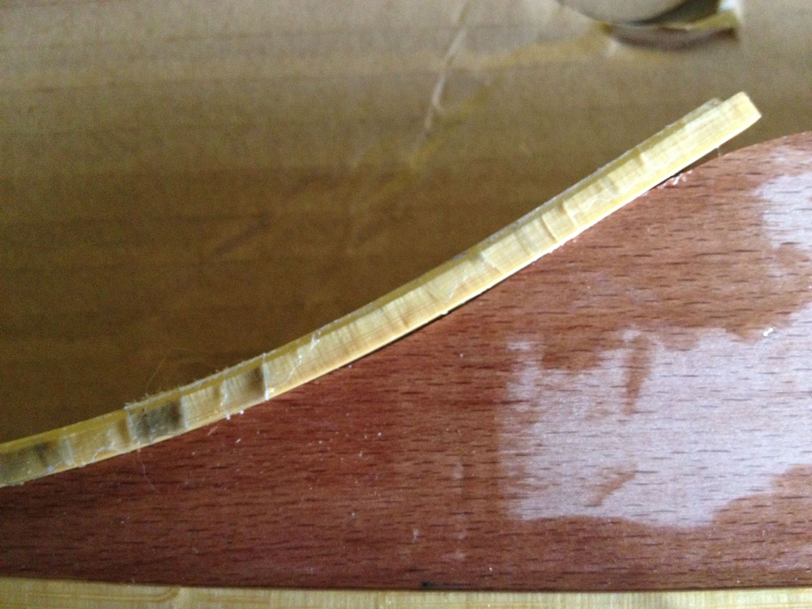 Meine Frage ist nun, wie ich das Abheben der Laminate verhindern kann? Auf jedenfall werde ich das nächste Mal die Steigung der Fadeouts etwas veringern. Eventuell hat ja noch jemand einen Tip für mich? Die zweite Frage ist, ob ich die Laminate irgenwie wieder voneinander trennen kann, um den Bogen eventuell neu zu verkleben?