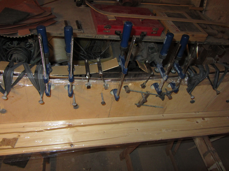 Ohne größeren Aufwand kannst Du Zwingen verwenden, allerdings brauchst Du dazu schon eine größere Anzahl. Die Zwingen können am unteren Ende in Löchern in der Form verankert werden; zum Pressen empfielt sich eine Gummimatte auf das Glas, darauf ein Streifen Holz zur Druckverteilung (an den Fades dünner, sonst passt er sich der Rundung nicht an).