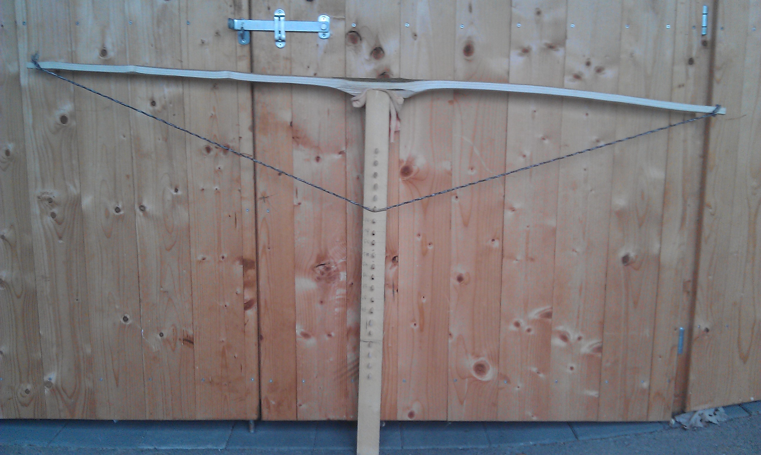 ich bin nun bei meinem bogen beim tillern angelangt, die schnur für die sehne dehnt sich leider sehr fest aber ich habe keine andere brauchbare schnur. nun biegt sich der eine WA schon einigermassen schön, der andere jedoch noch lange nicht genug, bzw. der eine WA hat schon eine leichte biegung zur sehne hin und der steifere ist leicht in die andere richtung gebogen. ich hab noch ein foto gemacht bei dem der bogen nicht gespannt ist und eines beim maximal-zug den ich bisher gemacht habe.