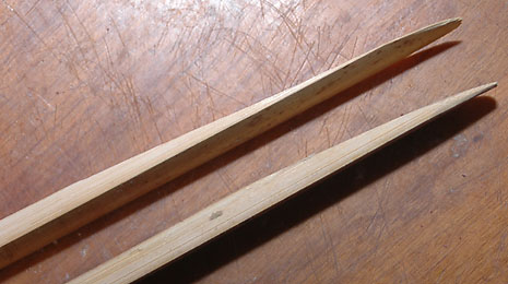 Ich schnitze meine Keile aus Bambusresten. Sie sind etwa 18 cm lang, 2,5 cm breit und etwa 6 mm dick.