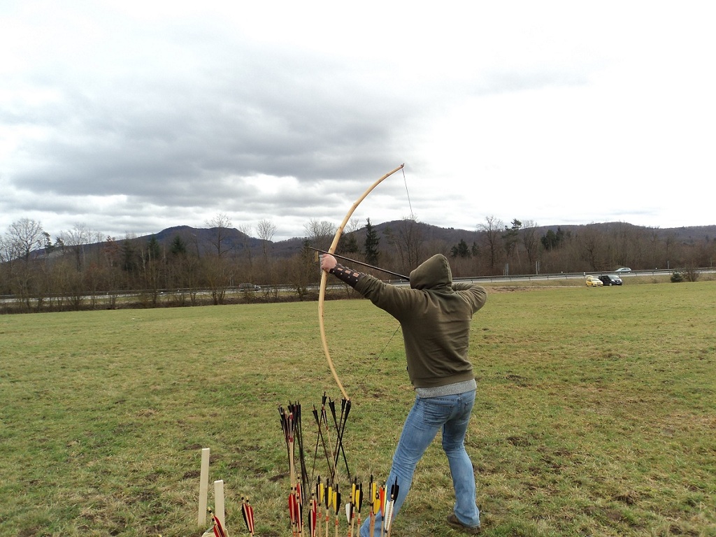 Wetter sehr windig, nasskalt und Wiese sumpfig ( fast wie in Azincourt hä hä, leider hat die in den letzten Tagen zu viel Regen abbekommen. Aber sonst wars ein rießen Spass. (Das Ziel war beim Treffer auf ca. 150 Schritte gesetzt.)