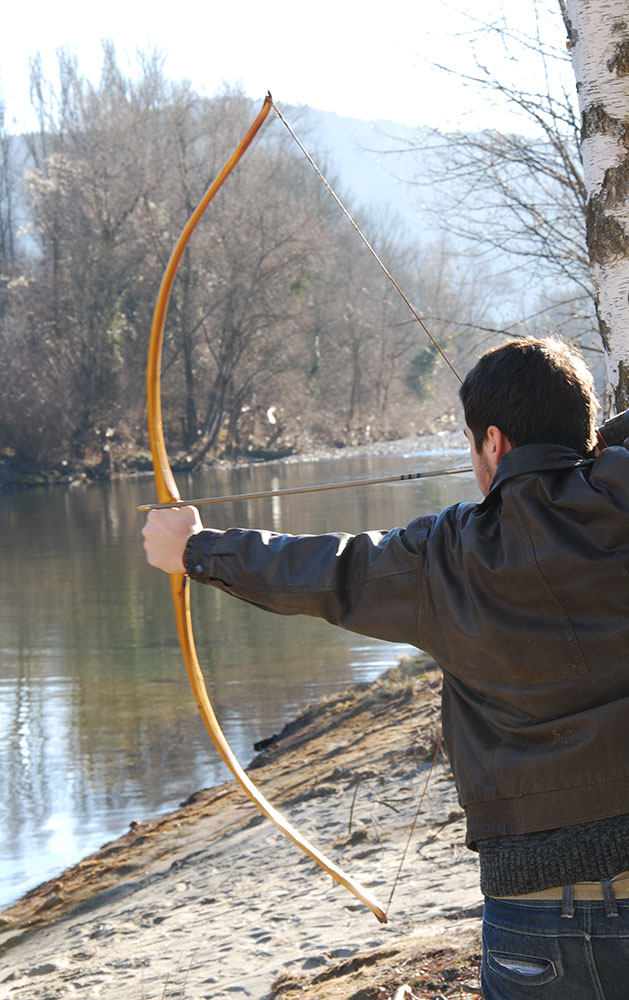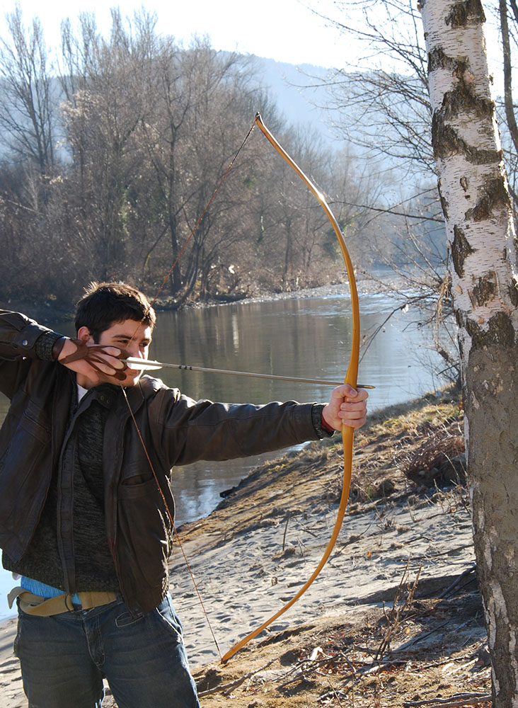 Wir haben Pfeil und Bogen nachgemessen, der Pfeil hat mit Spitze 29 Zoll und der Bogen hat direkt, Nock to Nock 161,5cm und über den Rücken 164,5 cm