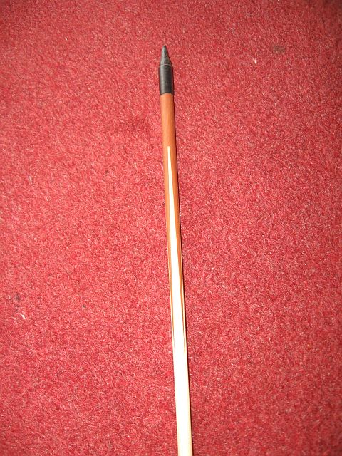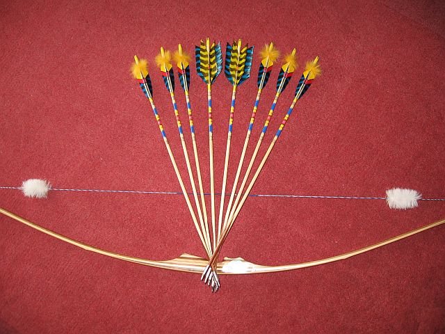 5/16" Schäfte hergestellt aus 1 cm Quadrat Fichtenholzleisten vom Baumarkt, selbst gefräst, 66 cm Lang, 32# Spine, 100 Grain Spitze, 4" Befiederung Shield gerade mit linken Federn und aus Federn voller Länge selbst gespleißt, Vorschaft aus Holz vom Zwetschkenbaum, schräger R/T Spleiß, und Tracer aus gefärbtem Kaninchenfell :o (an natürlichen Tod gestorben ;) ), insgesamt wurden es 16 normale Pfeile und 2 FluFlu's. Pfeilgewicht im Mittel ca. 24 Gramm, alle Pfeile liegen max. 1,8 Gramm auseinander.