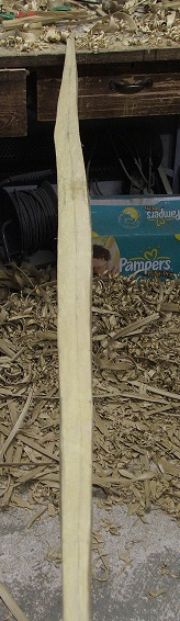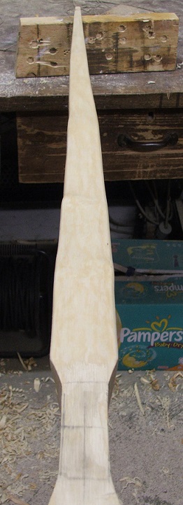 Heute habe ich den Bogen grob aus dem Stave geholt. Erst mal so wie angezeichnet die Breite ausgearbeitet und dann noch in der Stärke reduziert. Als ich ihm dann schon mal über den Bogenrücken schauen konnte, habe ich nach längerem hin und her noch einen guten halben cm in der breite abgenommen. Jetzt ist er gut 45 mm am Fadeout und pyramidial zu den Tips verjüngt, ein bißchen Charakter hat er auch O0 .