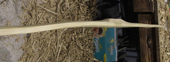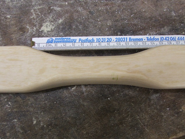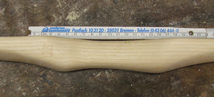 Der Rücken ist sauber und das Griffstück grob angelegt. Zu den Tips hin habe ich auch schon mal auf 12 mm verjüngt, aber da geht noch was ;) . Den Bodentiller hat er jetzt auch schon. Habe aber festgestellt das er ein bisschen rumzickt weil er ein paar seitliche Verwerfungen in den Armen hat und dadurch nicht gleichmäßig biegt oder verdrehen will. Da besteht die Gefahr das man mit tillern nicht fertig wird und zum Schluß ein Mädchenbogen rauskommt O0