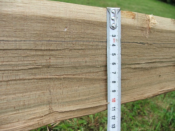 Der Stand auf dem Bild ist zwei Ringe über dem gewählten Rückenring. Den mach ich schon mal schön sauber um Spannrückigkeit oder andere Unebenheiten aufzudecken, so kann man sich besser an den letzen rantasten ohne rein zu schneiden. Vorher geh ich schon mal etwas grober ran. Der Stav ist ein viertel aus einem 25 cm Stamm, gespalten natürlich, und wurde nachträglich auf der Kreissäge etwas erleichtert um besser an die brauchbaren Ringe ranzukommen.