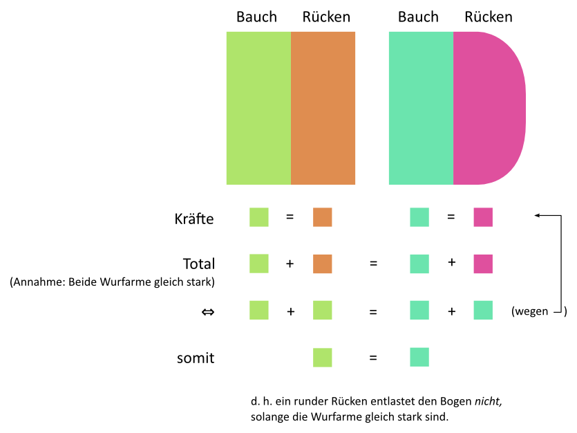 Einmal der Wurfarm intern. Dort gibt es eine Seite mit Zugspannung und eine mit Druckspannung. Die Kräfte beider Seiten sind gleich groß, ABER sie heben sich nicht gegenseitig auf. Das darf man so nicht sehen, denn beide Kräfte wirken in die gleiche Richtung.