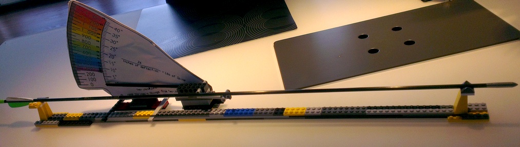 wie schon mal kurz erwähnt stelle ich Euch hier nochmal die Finale Version meines Lego Spinetesters vor. Über die Zahnstangen lässt sich das Gerät sehr präzise kalibieren. Dazu hab ich im Spine bekannte Carbon Pfeile genommen. Als Gewicht kommt bei mir eine Wasserflasche zum Einsatz die genau auf 904g befüllt wurde. Der Zeiger besteht aus einem abgeschnittenem Strohhalm.