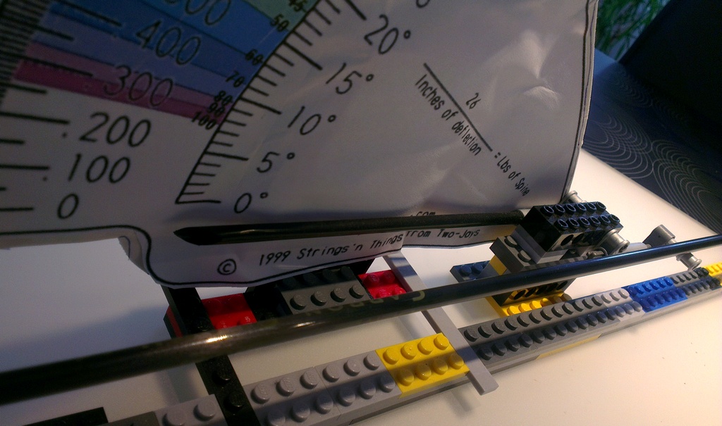 Die Idee mit den Rädern finde ich gut. Den Ausleger hab ich verstellbar gebaut um den Spinetester zu kalibieren. D.h. man könnte theoretisch auch ein Gewicht verwenden das von den 904 Gramm (2 lbs) abweicht. Zum abgleichen eignen sich am besten bekannte Karbonschäfte. Wird der Ausleger länger eingestellt ergibt sich für den Zeiger eine kleinere Auslenkung. Wird er kürzer eingestellt ergibt sich einer höherer Zeigerauschlag.
