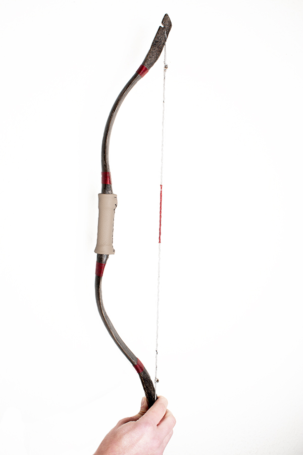 Der Bogen wurde danach mit Ebenholzlasur bestrichen und mit Holzlack versiegelt. Die Wicklungen sind reine Zierde. Die Sehne ist ne einfache Schnur aus dem Baumarkt. :-/ Erstens hab ich immernoch kein neues Garn da und zweitens ist so die Sehne etwas dicker und (denke ich) für ein Kleinkind einfacher zu fassen.