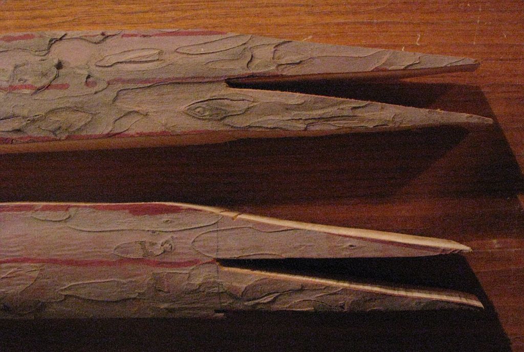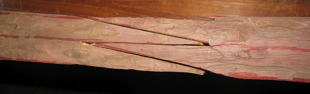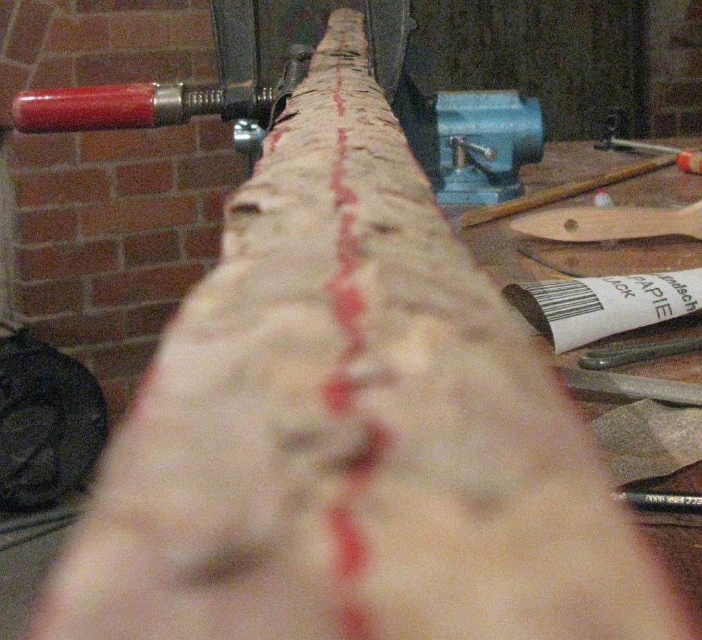 Dadurch, das ich zuerst eine dünne Schicht Epoxy auf die Fügeflächen gegeben habe, hat sich eine feste Schicht gebildet. Die hat dann das passgenaue spleissen verhindert, nachdem ich noch eine Ladung drauf gegeben habe. Dadurch hat sich der Stamm aufgespalten. Sicherlich waren auch die geringen Temperaturen in der Werkstatt unterm Dach mit verantwortlich. Gesägt habe ich den spleiss bei Aussentemperaturen um die 20 Grad...