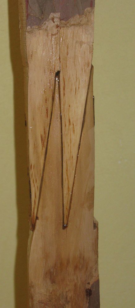 aber auch ein kleines durchgehendes "Ast"Loch jeweils dort wo eine Spleiss-Spitze durch die Stopperwirkung des Klebers steckenblieb. Ist meiner Meinung nicht so schlimm, da die Spleissverbindung eh steif bleiben soll.